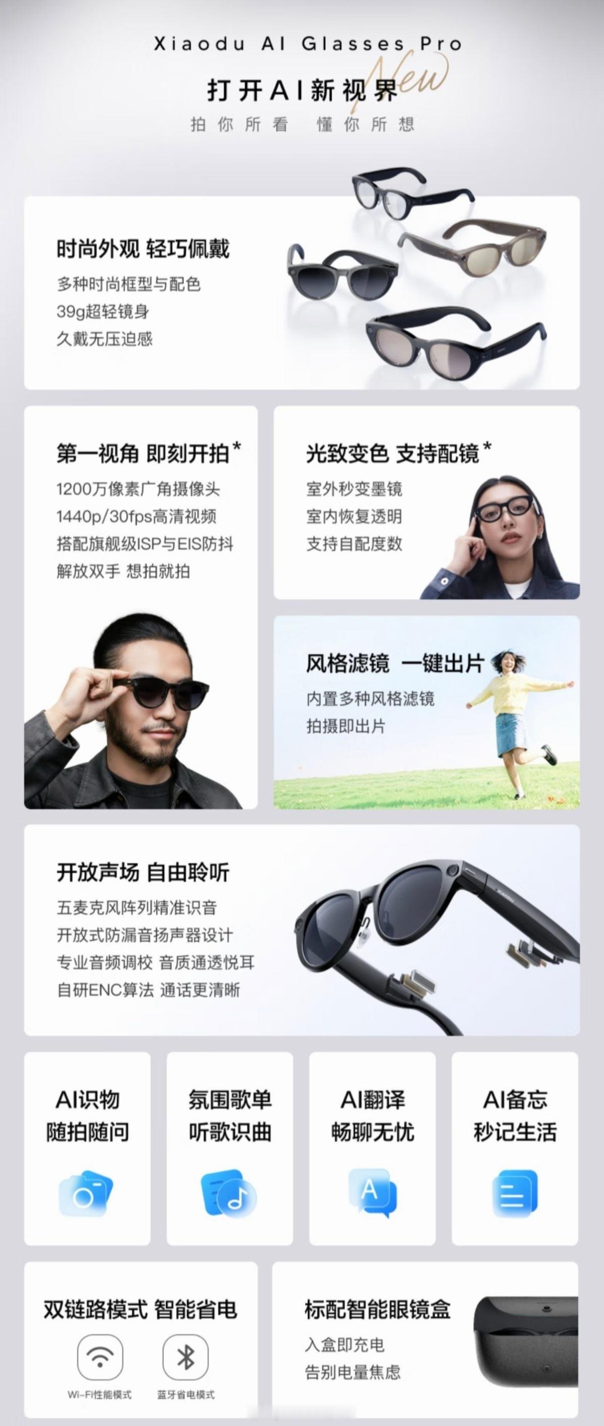 百度今天发布了小度 AI 眼镜 Pro,就一个版本,售价 2299,配置还行,就是这外观我不是很喜欢。配置:高通骁龙 AR1 处理器,重 39g,173mAh 电池,支持 30 分钟拍摄,眼镜盒内置 3000mAh 电池,索尼 1200 万像素镜头,4K 拍照,IP54 级防尘防水,开放式双扬声器,逆声场定向声学系统,14 种语言同传翻译。