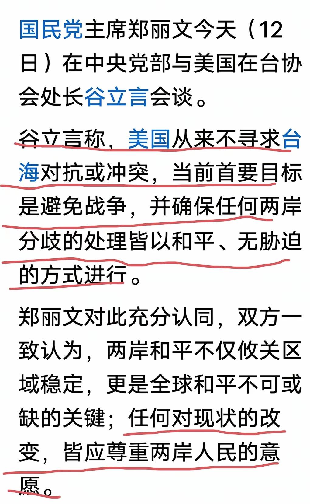 郑丽文最终还是没忍住与美国在台协会会谈了。 从美方的发言看,依旧披着虚伪的面纱,口是心非,表里不一,说一套做一套的把戏一次一次上演,你们不断供应台湾军火,不断派军事人员对台军培训,时不时美国新老要员窜访台湾都算什么?台湾是中国不可分割的领土,台湾问题是中国内政,与你老美有毛关系,你们爱管事,你们去管管加沙地带,俄乌地带,那里更需要你们去操心。 网友:郑坐正党部谷上门求见,谷的气焰打了下去,不敢乱指责,不敢提什么建议及政治走向,反而宾宾有礼,郑丽文赢了!我到还觉得好象解放战争后期的马歇尔! 拒绝老美约谈,老美主动放低身段上门拜访这已是最大的胜利了。原则性的问题没谈,讲两句客套的外交辞令也没啥大不了的。