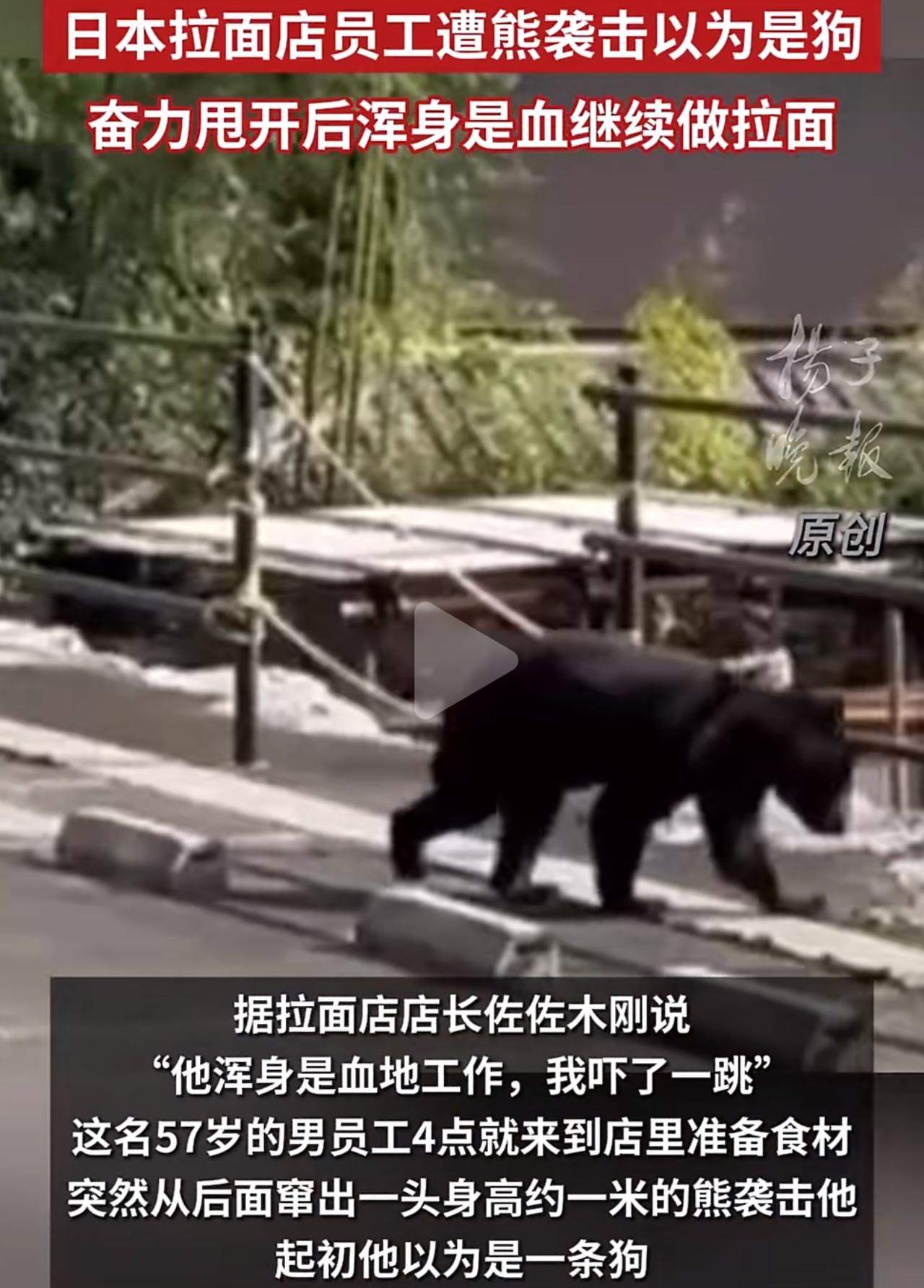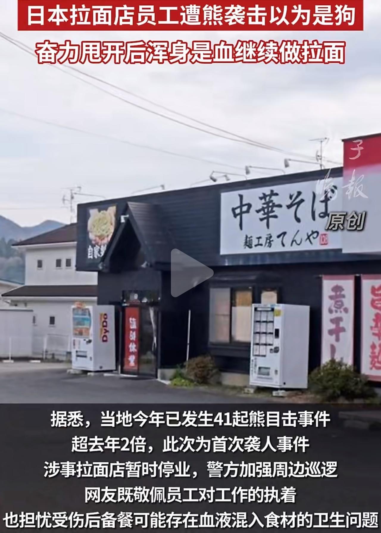 浑身是血还接着揉面?日本店员遭熊袭击后的操作,一半敬佩一半后怕! 凌晨5点的拉面店后厨,刚被黑熊抓得满脸是血,居然转身就接着揉面备料?这哪儿是现实啊,简直比动漫还离谱!但这事儿,就真真切切发生在日本青森县! 57岁的店员大清早开门开燃气,冷不丁被个一米长的黑影扑上来,一开始还以为是哪家的大狼狗,等反应过来,右眼旁边的皮都被撕烂了,血顺着脸往下淌。换谁遇上这事儿不得吓瘫?他倒好,硬生生把熊给甩开,捂着伤口就冲回厨房——满手满身都是血,心里居然还惦记着当天要卖的拉面食材,直到店长进门看到他浑身通红,魂都吓飞了,赶紧拽着他去医院。 网友直接吵翻了!有人说这是刻进骨子里的“职人精神”,还调侃“天天揉面练出的臂力,居然用来甩熊了”,甚至联想到《鬼灭之刃》里那股子执着的劲儿;但更多人看得头皮发麻:浑身是血还碰食材,这卫生能过关吗?命难道还不如一份拉面重要? 更让人揪心的是,这压根不是个案!就在同一天,日本秋田、新潟等地还有4人被熊袭击,今年已经有13人死于熊袭,伤者超170人。为啥熊疯了似的闯人类地盘?说白了就是饿的!气候反常让坚果减产七成,熊肚子空得直叫;农村没人住,大片农田荒了,人和熊之间的缓冲带没了,猎人又少又老,防控根本跟不上。 说实话,我真佩服这店员的韧劲,但真不认同这种拿命换工作的做法。这事儿哪儿是什么“匠人精神”的高光时刻啊,分明是生态失衡、农村衰退逼出来的无奈。人熊要共存,靠硬扛根本没用,先守住安全底线,把生态和防控的漏洞补上才是正经事!黑熊袭击 日式料理店拉面 日本食人熊