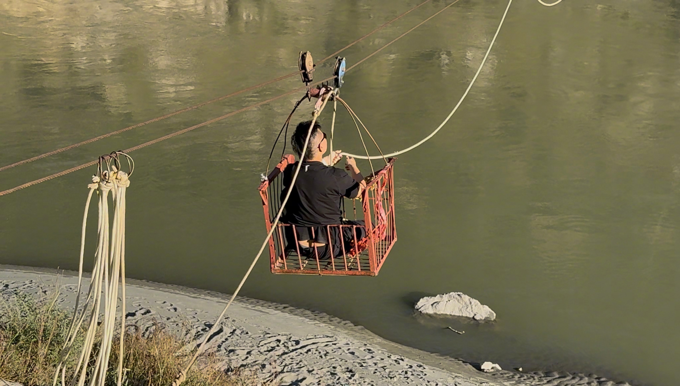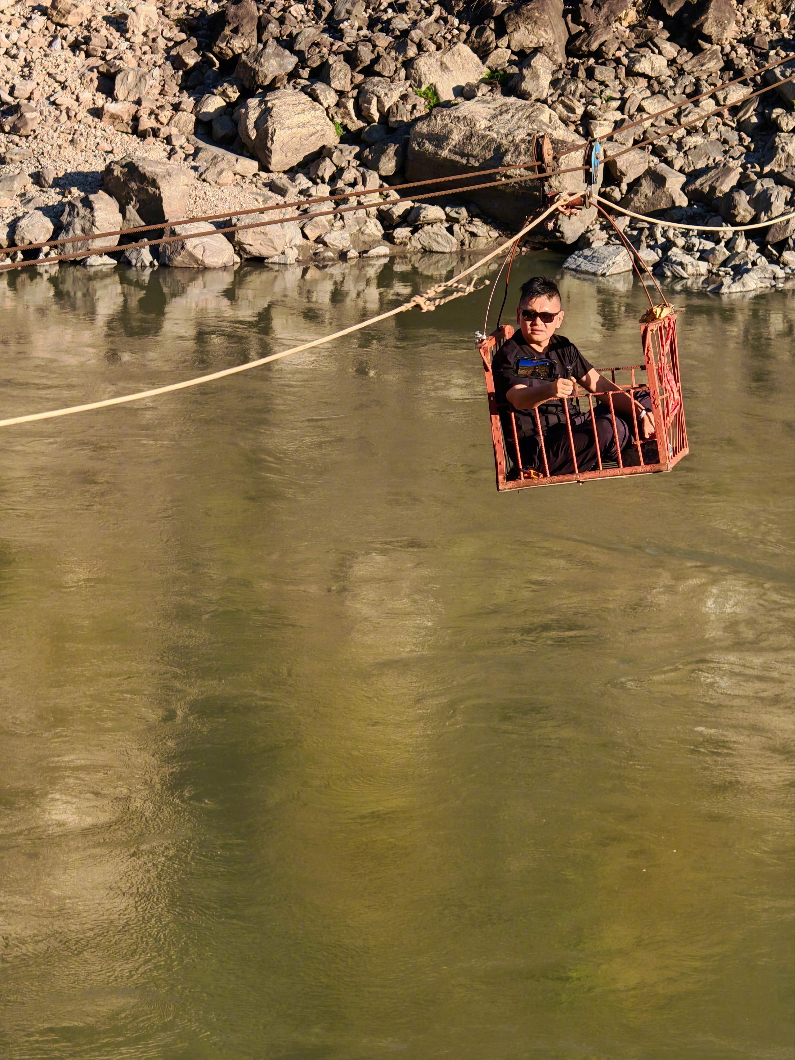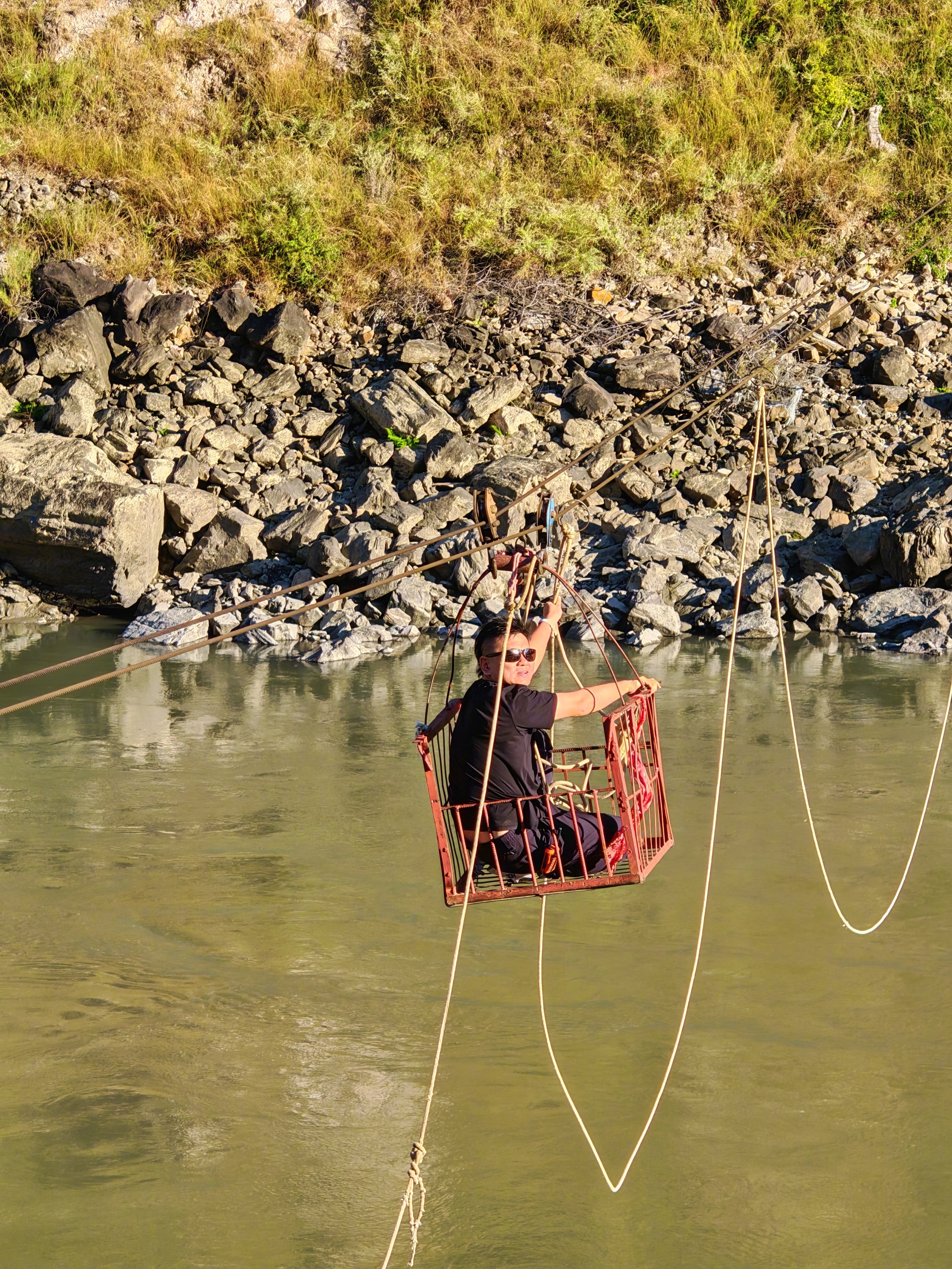 今天终于体验了云南/四川的摆渡吊篮,吊篮有点小,我坐着像个小仓鼠。你们看图1-图4,这是一个职业主播的素养哪怕摔了也高举摄像机,摔我不能摔设备。