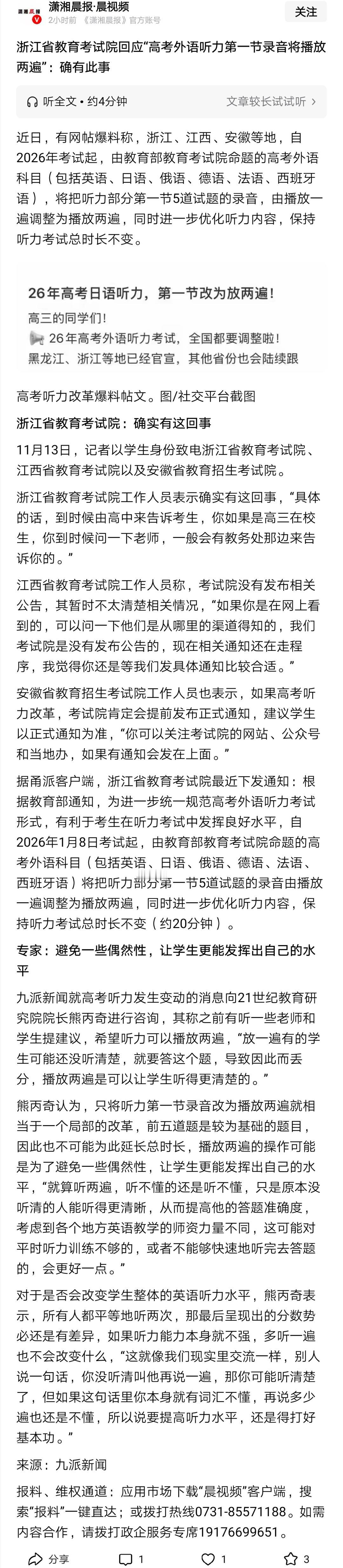 英语听力前五道题播放两遍,这是对考试的微调,目的是让考生听清楚一些,但对于听力差的学生来说,多播放一遍,听不懂的还是听不懂,所以,这对最终考试成绩影响不大。
