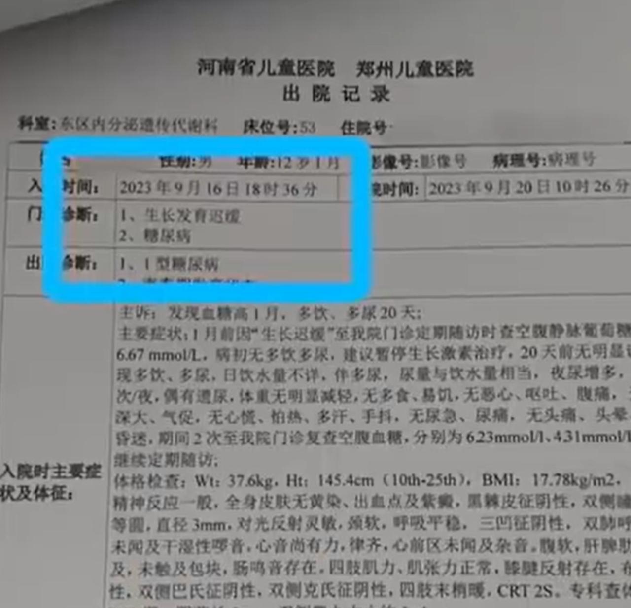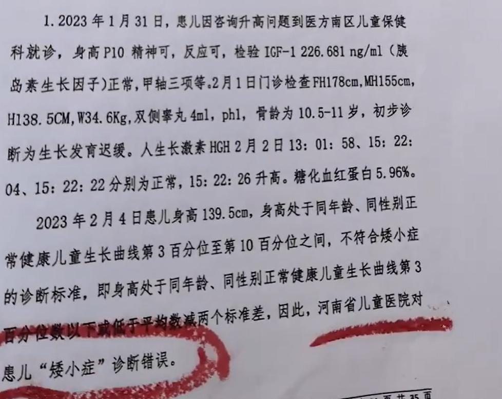 近日,河南省郑州市的一名14岁男孩因注射生长激素引发I型糖尿病,其家长与医院对簿公堂。 2年前,李女士12岁的儿子身高只有139.5厘米,远低于校内同龄人。焦急的李女士带着孩子去了河南省儿童医院保健科就诊,经过几项检查,被医生诊断为“矮小症”,预测成年身高只能到168公分。 在医生的建议下,李女士的儿子开始注射生长激素追高。每个月都要到医院进行血液等几项化验,一开始数据都很正常。 然而,孩子在持续注射半年后,身高没长多少,血糖却开始飙升。没多久,就被确诊了I型糖尿病,需要每天注射4针胰岛素控制。2年来孩子打了2000多针,身上都是密密麻麻的针眼(数据源自李女士)。 更让人无法接受的是,经过司法鉴定,李女士的儿子并不是“矮小症”,是医院诊断错误。 孩子白白挨了这么多针,没长高,还诱发了糖尿病,结果是误诊。拿到结果,李女士悔得肠子都青了。 儿童注射生长激素,是必须要进行生长激素激发试验的,要充分排除遗传病如糖尿病等在内的潜在风险,涉事医院在小李儿子的诊疗行为中被确认存在过错,未按医疗规范进行。 然而,儿童医院却将“事故”的责任全部归结到涉事医生身上,并称已经走司法程序了,法院判多少医院赔多少。 生长激素可以说价格不菲,对普通人来说是笔不小的费用,因此医生建议患者注射前都非常慎重。孩子都没达到矮小症的标准,这医院就建议打激素,是为了创收吗? 这糖尿病要伴随孩子一生,赔多少钱能够弥补呢!