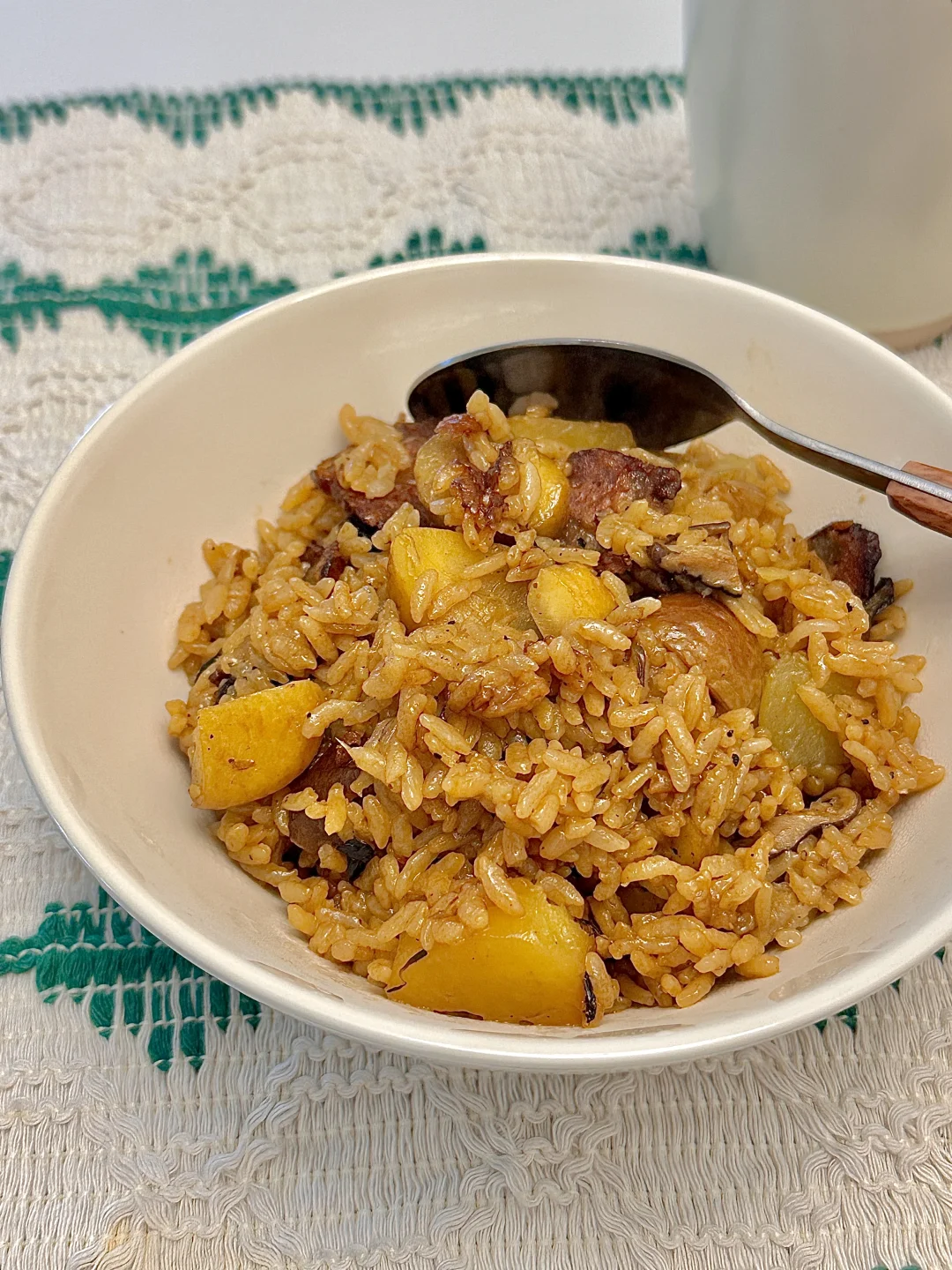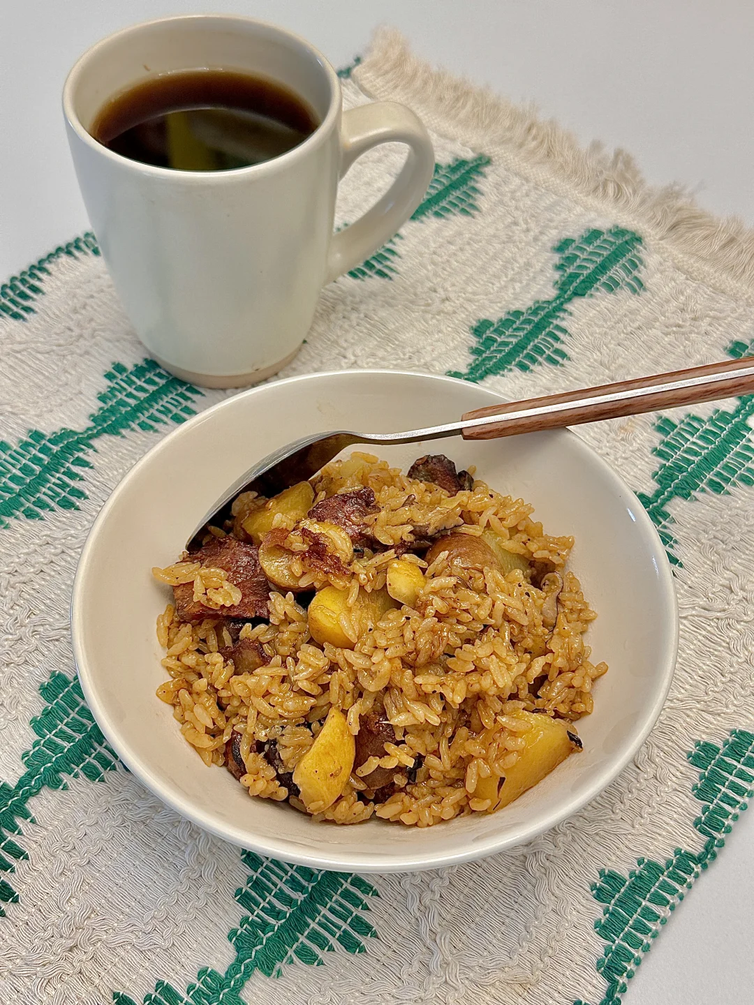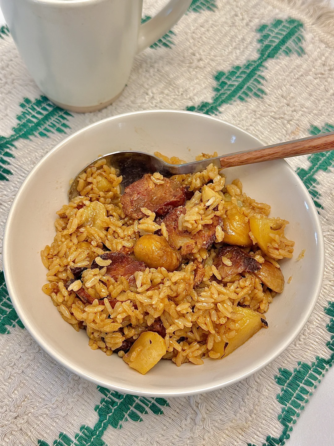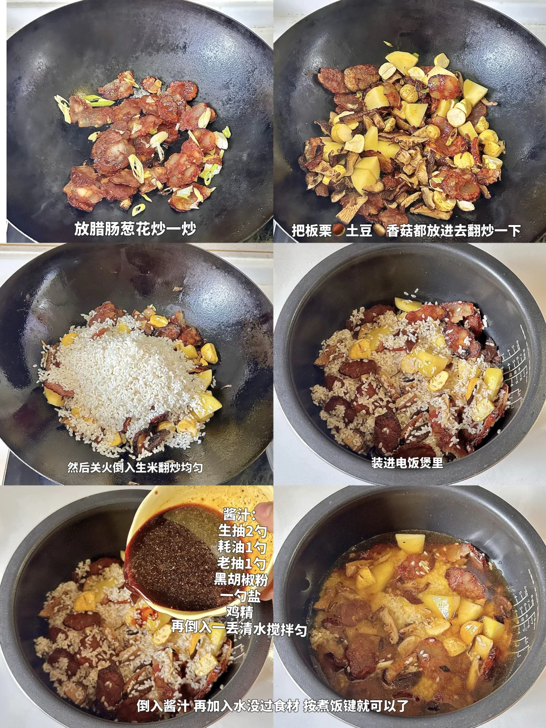 又到了吃腊肠的季节 腊肠的咸香和板栗粉糯 咸甜的味道太上头啦,完全没有油腻感 板栗腊肠焖饭谁做谁好吃😋真巨香! 🥬食材:大米 腊肠 香菇 板栗 土豆 葱花 做法图四 简单又好吃😋 快去试试吧!