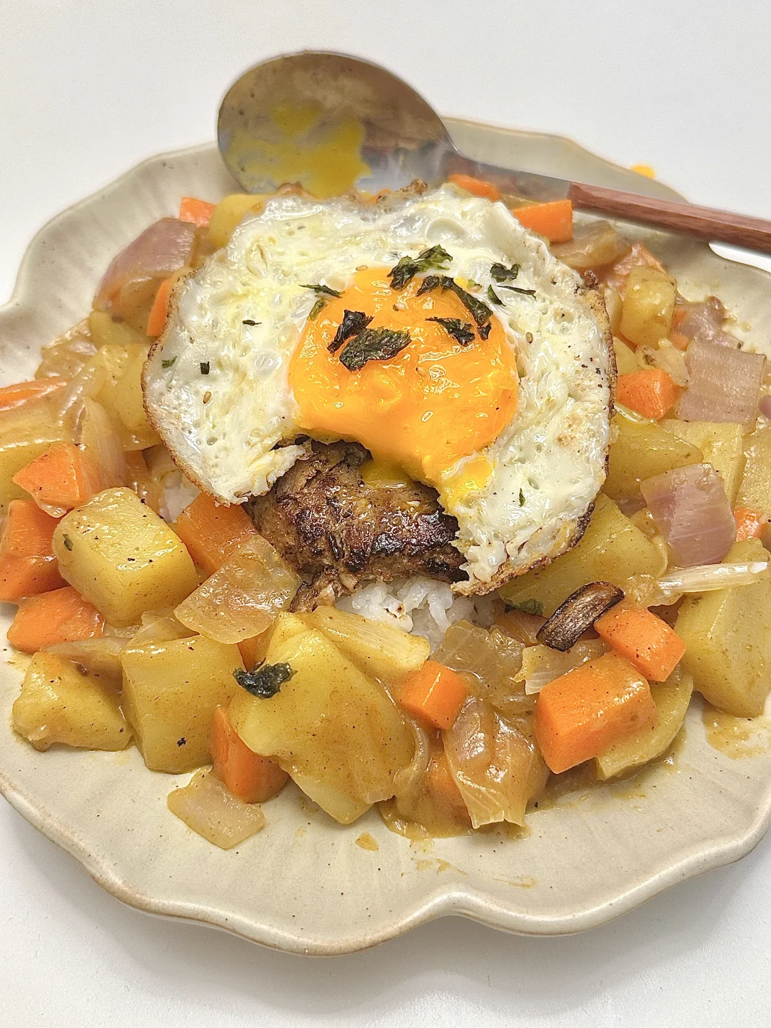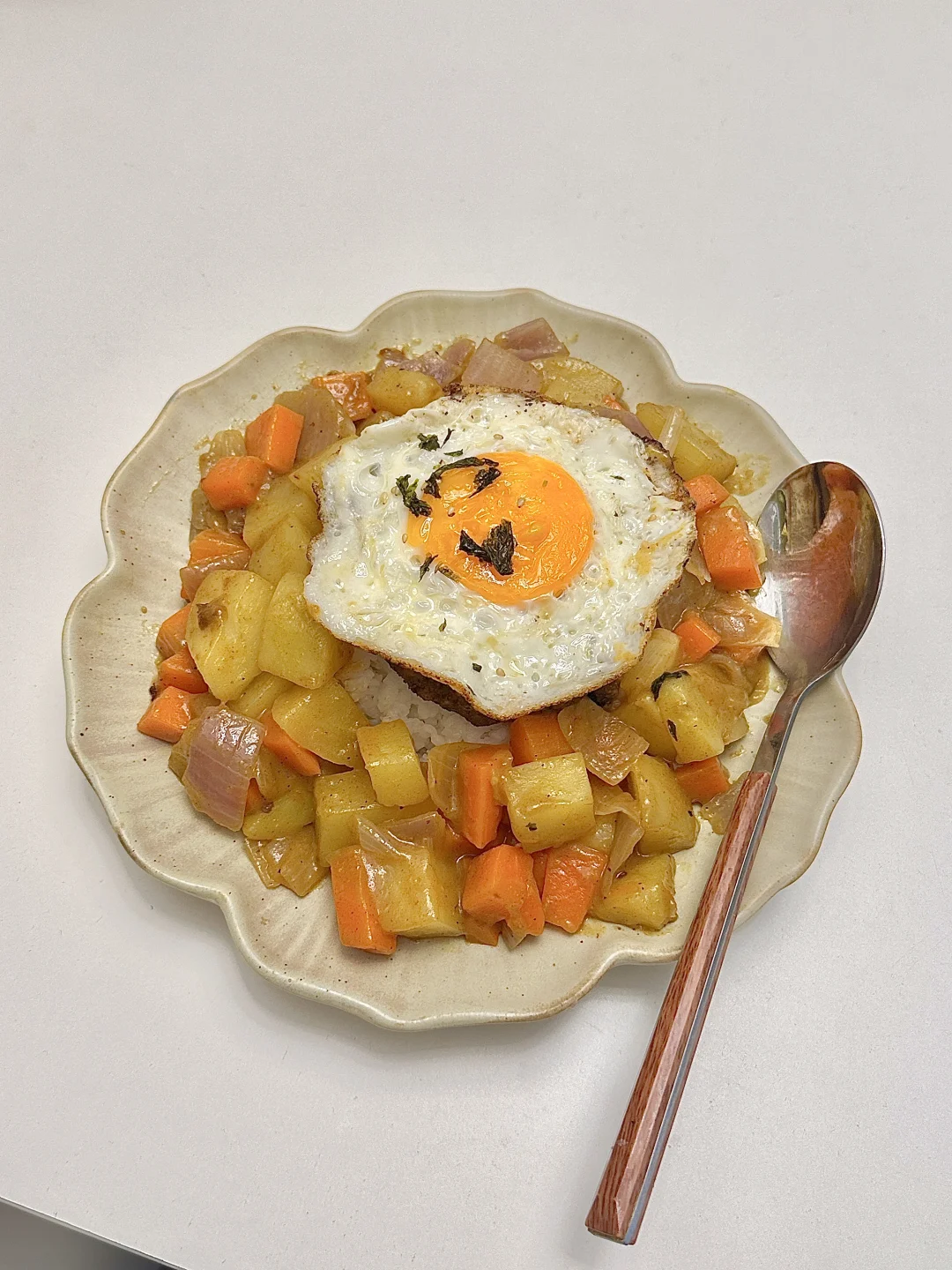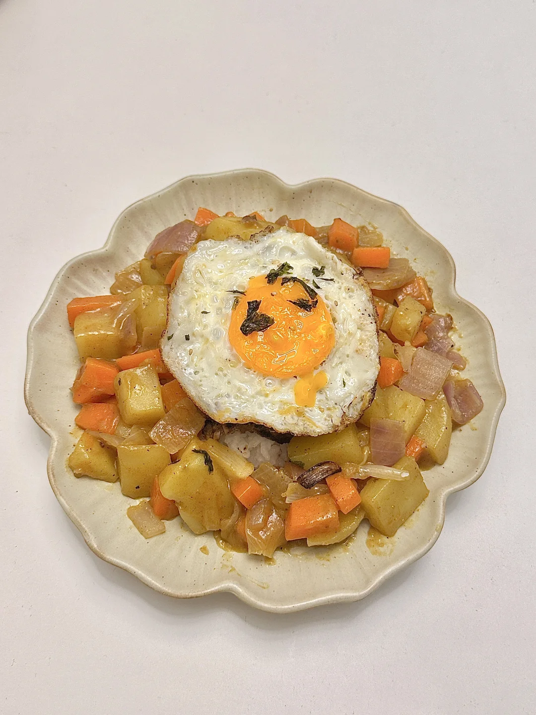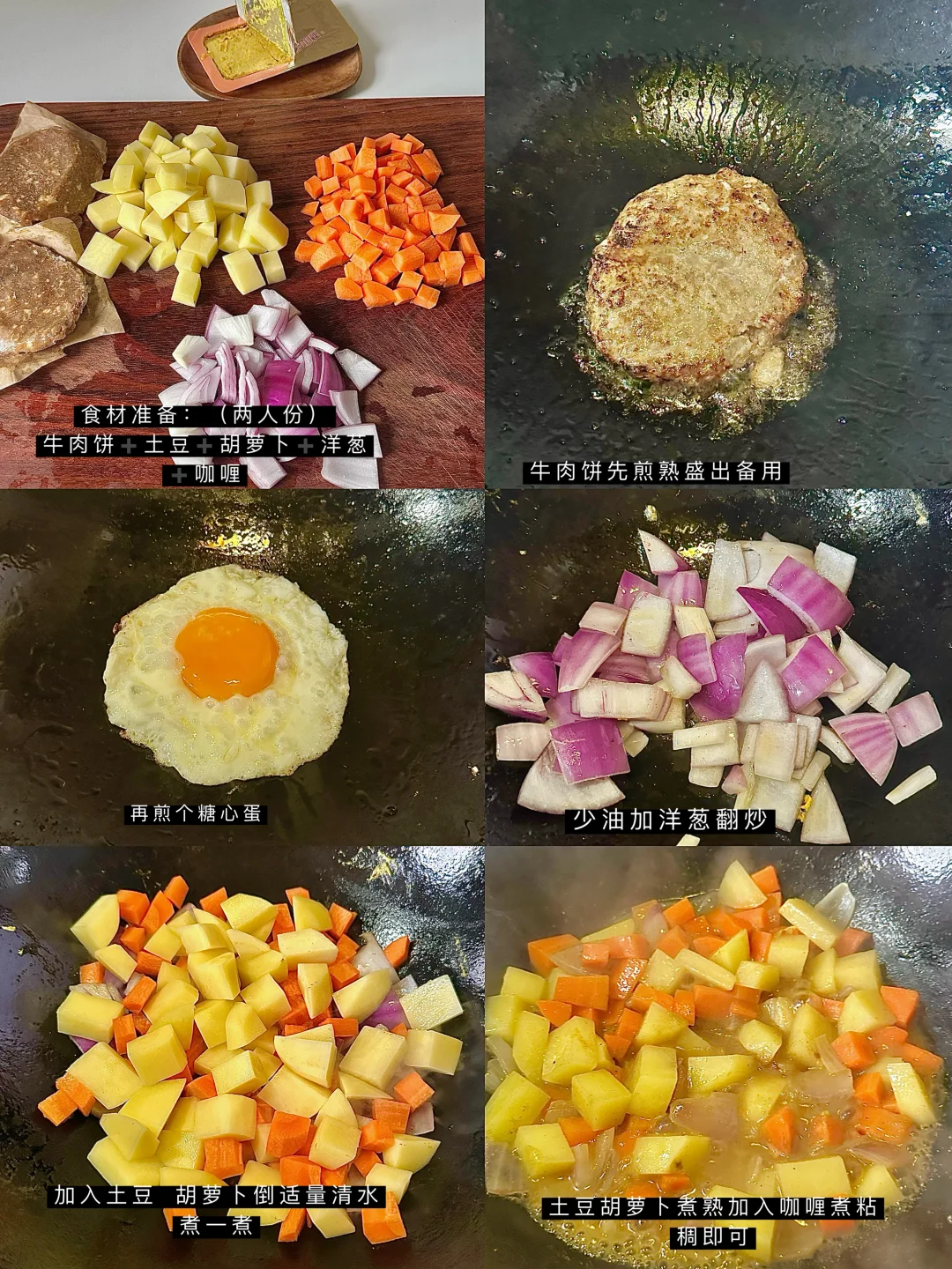 冬天的减脂餐也要好好吃😋其实冬天比夏天更好瘦! 好久没吃咖喱饭了,冷呼呼的天做一份咖喱牛肉饭 浓郁的汤汁裹满米饭一口大满足! ~ 👩🏻🍳做法: 1️⃣牛肉饼解冻后 少油煎熟备用 再煎个糖心蛋备用 2️⃣锅中少油下洋葱炒香 加土豆🥔胡萝卜继续炒 3️⃣加入清水没过食材 煮熟土豆 加入咖喱块 4️⃣小火煮汤汁浓稠就可以了 简单的食材➕简单的烹饪 就是好吃的减脂餐 好好吃饭 健康减脂 想想明天吃点啥!