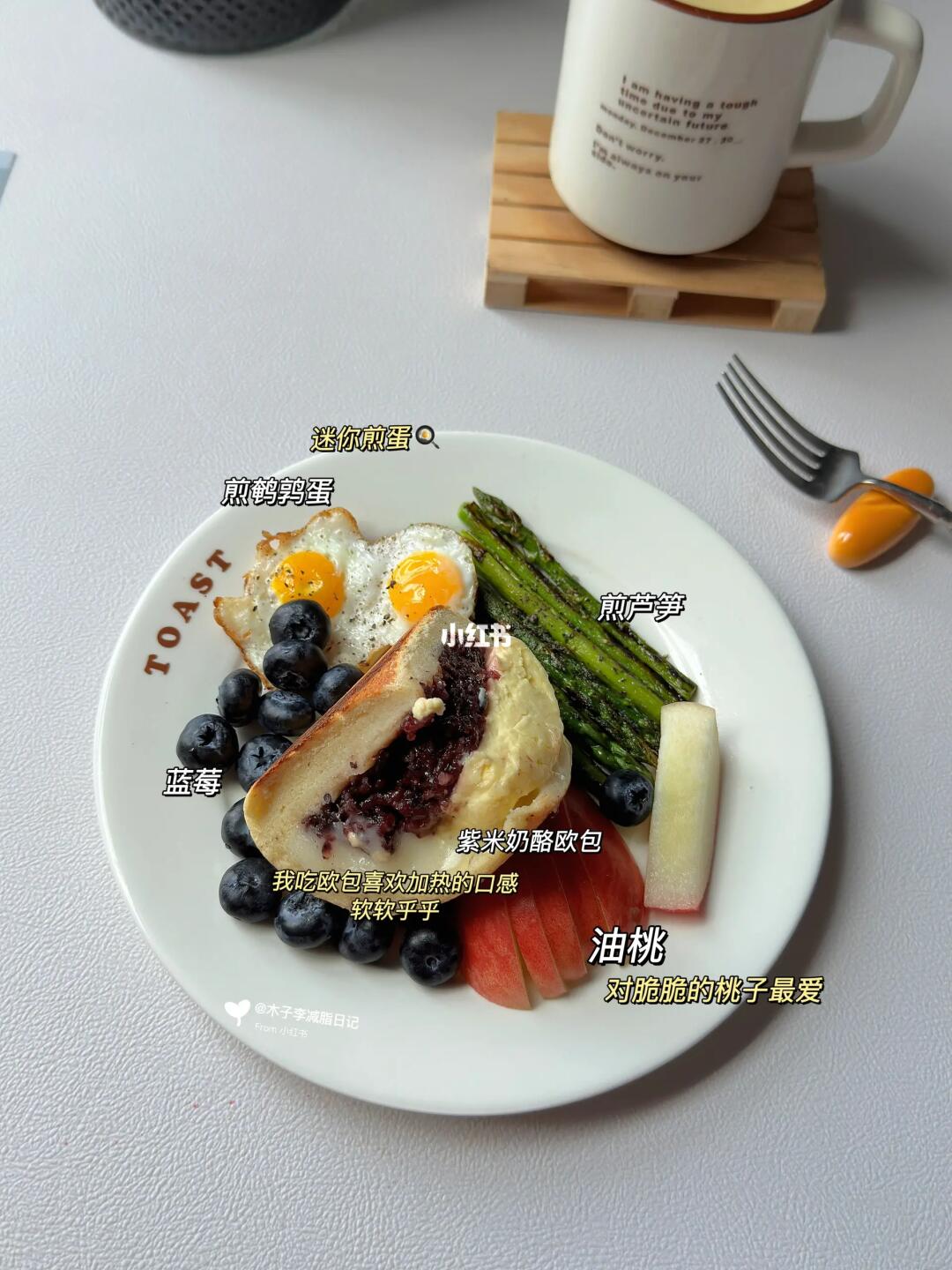 🥣早:紫米乳酪欧包 | 豆浆 | 油桃 | 煎芦笋 | 蓝莓 | 煎鹌鹑蛋