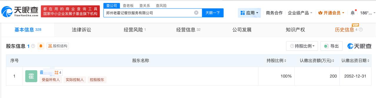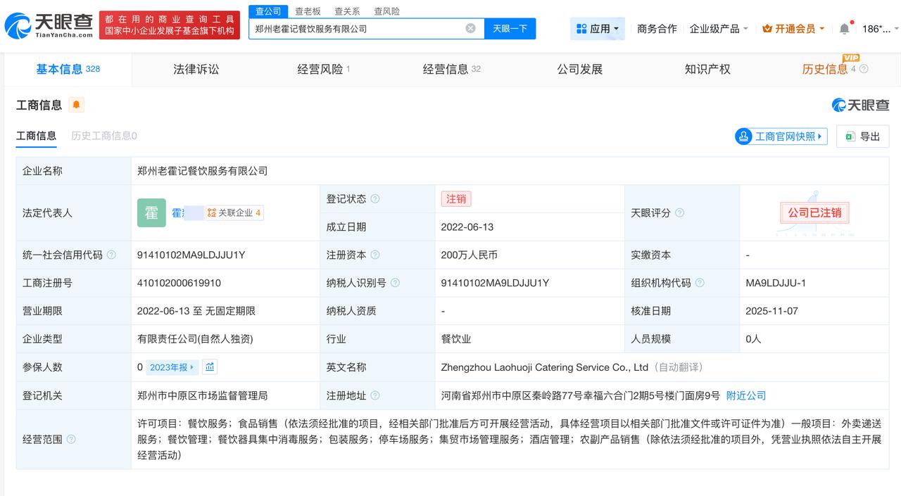 续面事件老板近期注销名下公司 续面事件老板已注销名下多家公司 续面事件老板回应被女顾客起诉 据报道,今年8月,“3女子带4孩续面被拒”事件持续引发网友关注,而今面馆老板霍先生新社交账号已被封禁。 天眼查工商信息显示,11月7日,郑州老霍记餐饮服务有限公司登记状态由存续变更为注销。该公司成立于2022年6月,法定代表人为霍某某,注册资本200万人民币,经营范围包括餐饮服务、食品销售等,由霍某某全资持股。任职信息显示,霍某某名下关联4家企业,仅郑州市中原区仕怡餐饮店为存续状态。 天眼查信息: