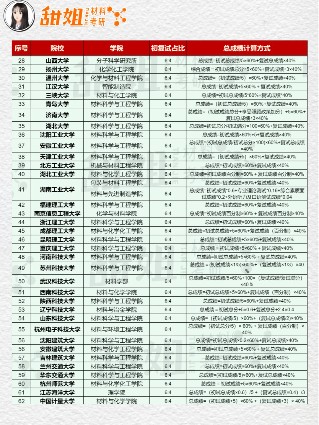 初复试占比就是初试和复试占一定的比例权重组合成总成绩,最后按照总成绩的高低来进行排名录取。初复试占比一般有:5:5,6:4:7:3以及初复试相加,部分院校也会有特殊的计算方式。这期给大家分享一下初复试占比为6:4的院校,其他类型之后会给大家陆续安排上的! 材料考研 25考研 材料与化工 考研复试 初复试占比 考研初复试占比 复试占比
