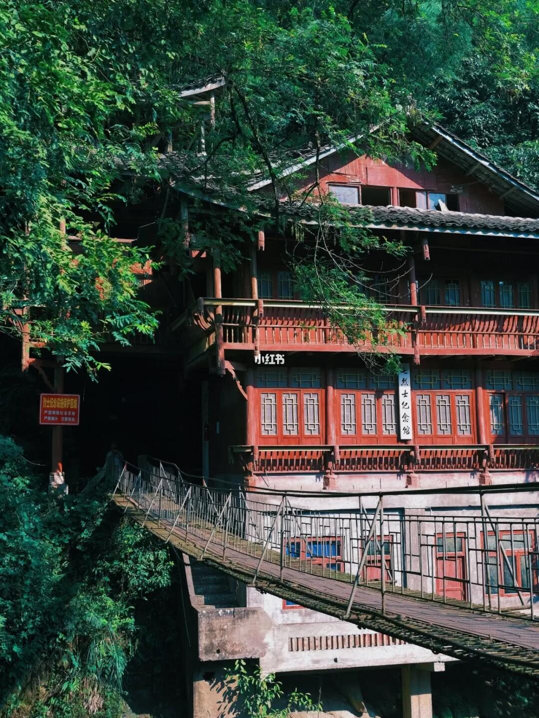 2⃣吊桥区域:钢缆吊桥、红色的沿河庙宇和森林,组合成了古镇最有宫崎骏风格的画面