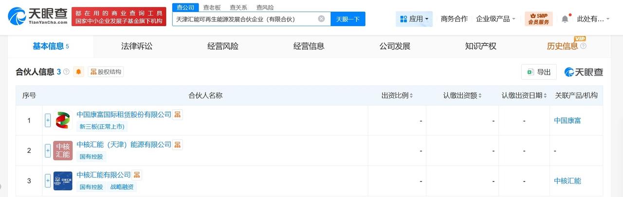 中核汇能等在天津成立可再生能源发展合伙企业出资额31.7亿 天眼查工商信息显示,近日,天津汇能可再生能源发展合伙企业(有限合伙)成立,执行事务合伙人为中核汇能(天津)能源有限公司,出资额31.7亿人民币,经营范围含发电业务、输电业务、供(配)电业务,风力发电技术服务,太阳能发电技术服务,节能管理服务,发电技术服务。合伙人信息显示,该合伙企业由中国康富国际租赁股份有限公司、中核汇能(天津)能源有限公司、中核汇能有限公司共同出资。 天眼查信息: