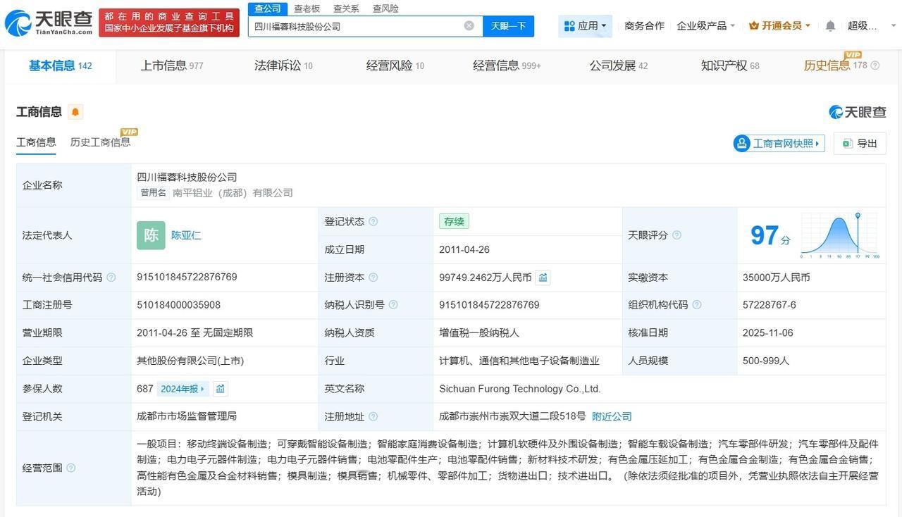 福蓉科技增资至9.97亿增幅约29.87% 天眼查App显示,近日,福蓉科技发生工商变更,注册资本由约7.68亿人民币增至约9.97亿人民币,增幅约29.87%。 四川福蓉科技股份公司成立于2011年4月,法定代表人为陈亚仁,经营范围含移动终端设备制造、可穿戴智能设备制造、智能家庭消费设备制造、计算机软硬件及外围设备制造等。股东信息显示,该公司由福建省南平铝业股份有限公司、福建省冶控私募基金管理有限公司、成都兴蜀投资开发有限责任公司等共同持股。 天眼查信息: