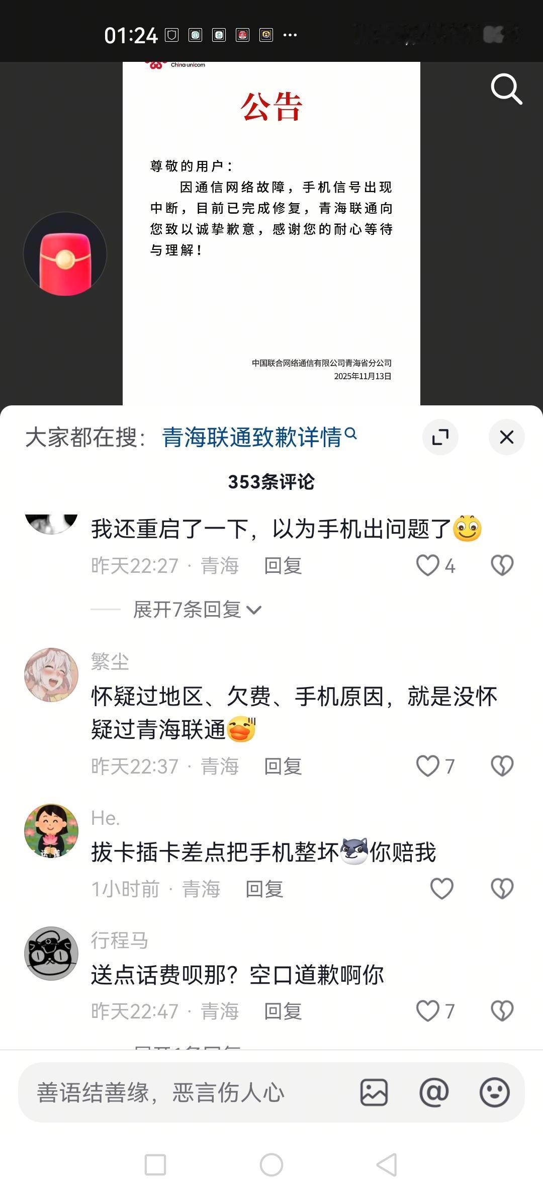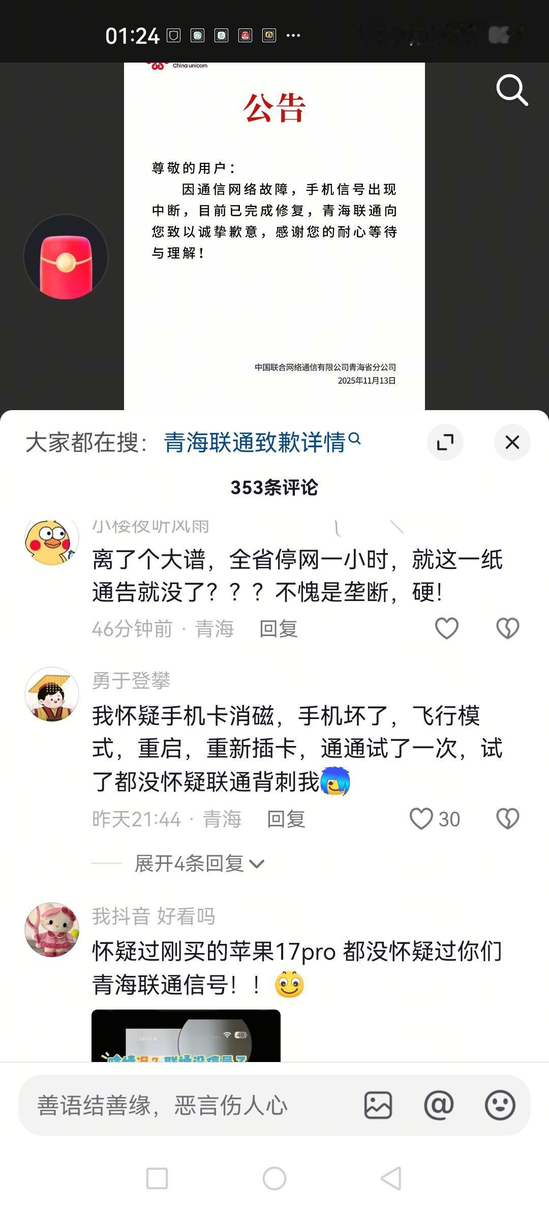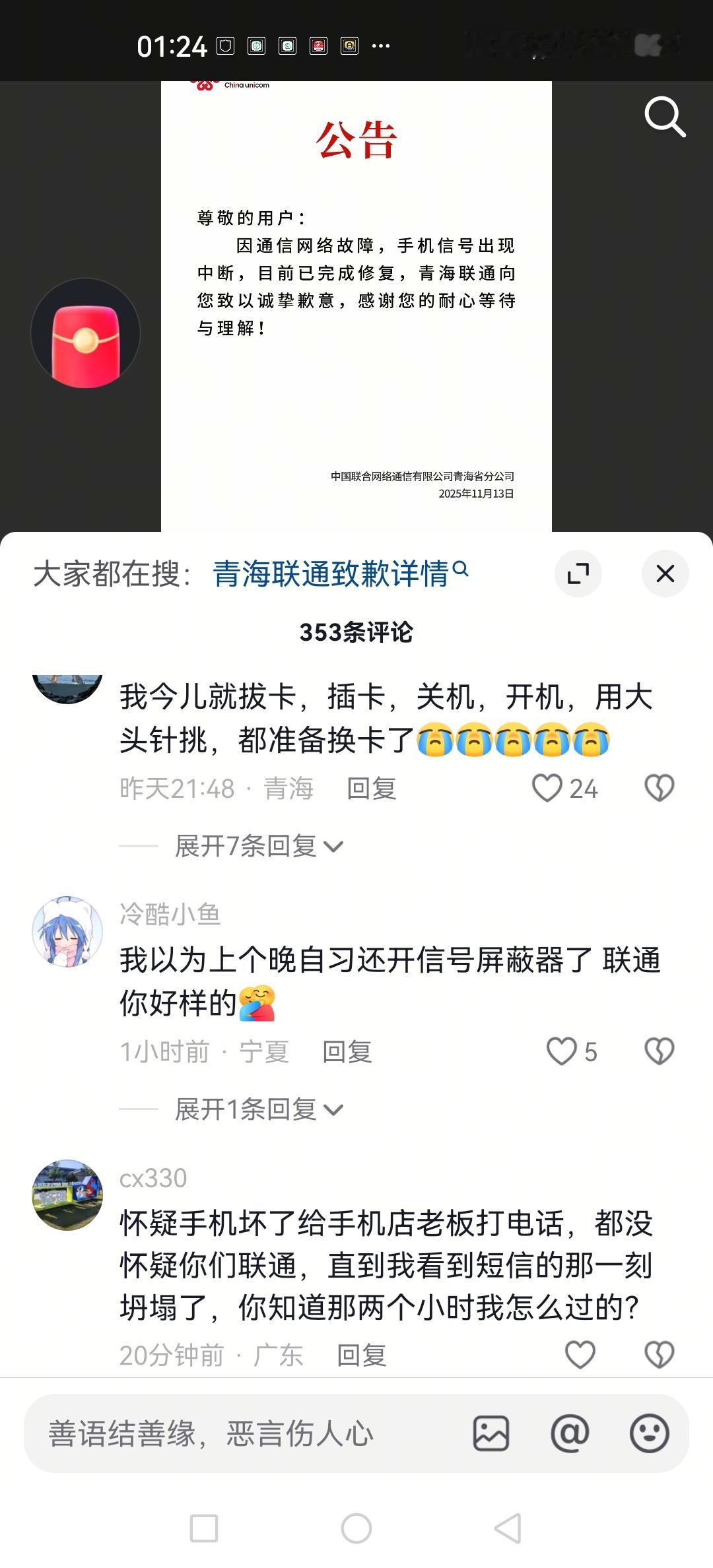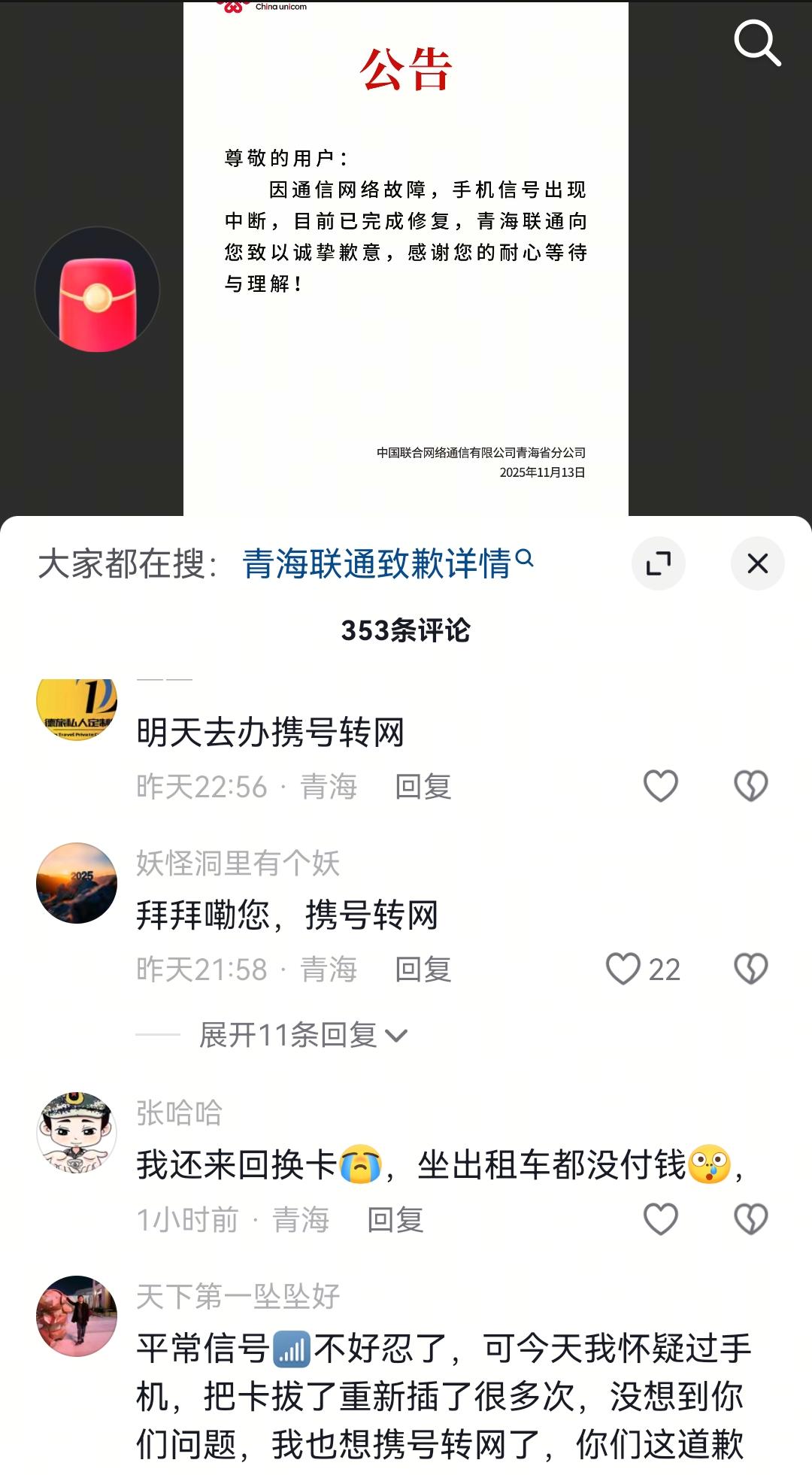 预计明天大批青海联通用户会携号转网! 很多用户表示自己怀疑没有网费自己的手机问题,都没有怀疑联通的网有问题! 原因是青海多地出现了联通用户没有办法连接到网络以及没有办法拨打电话的情况。特别是对网络依赖度比较高的外卖员,在送餐期间,根本就没有办法完成相应的操作。 这一次青海多地联通没有办法连接到互联网,造成的影响确实是太大了。各位是怎么看的?欢迎评论区留言。