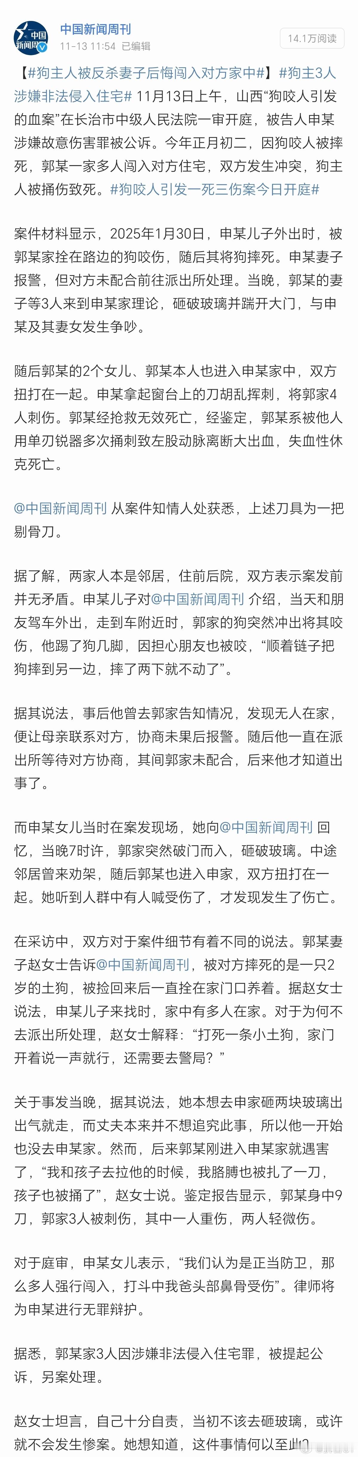 起诉书里提到的人物关系稍微有点乱,我给大家翻译下。最先进来的3个人,分别是死者妻子赵某某及妹夫韩某、外甥刘某。这3个人是边砸门,边让被告开门,期间还把被告家的窗玻璃给砸了。死者外甥韩某把大门踹开以后,与被告及其妻女在院内发生争吵。邻居这边听到动静后,赶过来调解,没成。随后,死者的两个女儿也加入战局,随后死者也来了。被告这边说,对方一共来了9个人,综合报道来看,分别是死者妻子、妹夫、外甥、死者及两个女儿,还有邻居3人。被指控非法入侵住宅罪的,是邻居那边的3个人。检方认为,被告刺伤死者外甥韩某,属于正当防卫。看前述起诉书也知道,这家伙叫得最凶,冲的最靠前。但检方同时认为,被告刺死死者,属于防卫过当。整体情况大概就是这么回事。
