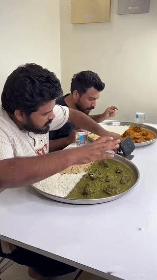 这是印度咖喱手抓饭比赛现场。 两名参赛者要比谁能在最短的时间将面前这一大盘子手抓饭吃完。 谁就获胜。 印度美食看起来都是各种糊糊? 用料多,口味重,吃起来根本就不用牙?印度美食手抓饭