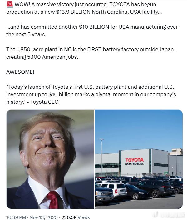 丰田在北卡州的一座139亿美元 的新工厂开始投产,并承诺在未来 5 年内再向美国制造业投入100 亿美元。这座占地1850英亩的北卡工厂是丰田在日本以外的 第一家电池工厂,将创造5100个美国就业岗位。丰田首席执行官:“今天,丰田首座美国电池工厂的启用,以及未来高达100亿美元的额外美国投资,标志着我们公司历史上的一个关键时刻。”