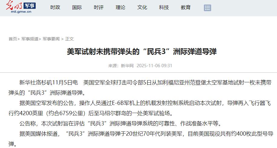 美洲际导弹升空,特朗普通知全球,要废掉中国王牌,普京先出手了 11月的加州夜空本来挺安静,突然一道亮白的裂缝把天撕开,范登堡太空军基地里,一枚“民兵3”洲际导弹拖着橘红色的光带直冲上天,尾焰像条狂舞的火龙,一路奔向太平洋深处。 这动静不小,太平洋对岸的中俄刚捕捉到导弹轨迹,佛州迈阿密那边就传来了特朗普的高调声量,对着台下支持者喊着要推动“中美俄无核化”,话里话外还踩了中国一脚,说咱们的核力量“远远落后”于美俄。 一边刚把核导弹射向大洋,一边就喊着要搞无核化,这波操作搁谁看了都得皱眉头。要知道“民兵3”是美国陆基核力量的核心,虽然是上世纪70年代的老型号,但每年试射都是在秀肌肉,更别说这次试射前,美国刚更新了核威慑战略,明确把中俄列为“主要核威胁”。现在导弹还在天上飞,就急着喊和平,这套“先打后谈”的套路,明眼人都能看出是想拿着核大棒逼别人让步。 不过特朗普大概没料到,普京早就把美国的套路摸得门儿清,出手比他快了不止一步。就在“民兵3”点火升空的同时,俄罗斯那边已经把压箱底的“新家伙”摆到了台面上,不是概念图,是刚完成实战化测试的硬家伙。 最扎眼的就是“海燕”核动力巡航导弹,普京亲自确认这玩意儿刚完成最终测试,10月21号那次试射,足足飞了15个小时,绕着北极圈飞了1.4万公里,期间还不停变轨,把反导系统最擅长的拦截路线全绕开了。 这导弹最狠的地方是核动力发动机,理论上航程无限,想绕地球飞几圈都行,而且能贴着海平面几十米的高度飞行,美国部署在全球的反导雷达根本没法有效探测。 俄罗斯军事专家说得直白,以前美国反导系统都盯着北极方向,觉得这是俄罗斯导弹的必经之路,现在“海燕”能从南美洲或者大西洋方向绕过来,等于让美国的防御网成了筛子,要是想补这个漏洞,花的钱得翻倍。更关键的是,普京说了,这武器全世界独一份,别的国家连仿造的门儿都没有,2027年就能正式部署。 紧跟着“海燕”亮相的,是被西方叫做“末日鱼雷”的“波塞冬”核动力无人潜航器。普京透露这玩意儿刚完成核动力测试,不仅能从核潜艇上发射,核反应堆还能稳定运行,这意味着它能在1000米深的海底待上几个月,以每小时160公里的速度悄无声息地巡航。 这么看下来,美国这次试射“民兵3”更像是给自己打气的“心理补课”。毕竟普京先是亮“海燕”,再晒“波塞冬”,每样都精准打在美国反导系统的软肋上,美国再不秀一下肌肉,盟友那边都要慌了。 可尴尬的是,“民兵3”是固定发射井部署,真打起来第一时间就会被盯上,而俄罗斯的新武器要么能绕着地球跑,要么能在海底藏几个月,根本不是一个量级的威慑。五角大楼内部报告都承认,现有反导系统对“海燕”和“波塞冬”基本无效,想研发新系统至少要10年。 面对特朗普“中国核力量落后”的说法,中方没跟着凑热闹互怼,但立场摆得明明白白。外交部发言人早就说过,中国核力量的发展是为了维护国家安全,始终保持“精干有效”,从来不搞军备竞赛。 美国想拿着“无核化”当幌子,其实是想让中俄削减核力量,自己偷偷保持优势,这种双重标准早就被看穿了。普京的思路很直接:你秀肌肉,我就亮更狠的家伙,你搞技术封锁,我就砸你防御软肋,反正谁也别想独大。 中国则是另一种路数,不跟着美俄比数量,而是把力量集中在“够用、管用”上,同时反复强调核裁军应该“循序渐进、公平合理”,既不被美国带节奏,也守住了自身安全底线。 西方媒体这会儿也看出门道了,美国《纽约时报》虽然嘴硬说“怀疑‘海燕’的实战价值”,但也承认这会让美国防御成本翻倍;路透社更直接,说普京亮武器就是给美国划红线:“别拿核威慑当筹码,你有你的牌,我有我的杀招。” 就连美国盟友都慌了,德国国防部私下给五角大楼发函,问“要是俄罗斯真部署这些武器,欧洲的防御怎么办”,毕竟欧洲离俄罗斯可比美国近多了。 其实说到底,这场博弈的核心不是谁的武器更狠,是霸权逻辑和安全平衡的对抗。美国总想着用核优势压制别人,把单边制裁那套用到核领域,觉得自己能靠武力定规矩。 但中俄的回应很清晰:你想搞霸权,我们就有办法破你的霸权;你想拿核力量当武器,我们就有能力让你的武器失效。中国一直说的“共同安全观”不是空话,毕竟核战争没有赢家,真要打起来谁也跑不掉。 要是美国还抱着“一边造弹一边谈和平”的双标不放,只会把自己逼到更被动的境地——毕竟谁也不想跟一个随时拿核大棒挥来挥去的国家打交道,而中俄的回应,正是给这种霸权逻辑上了最清醒的一课。