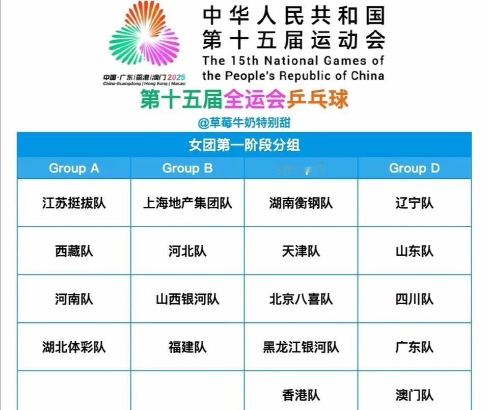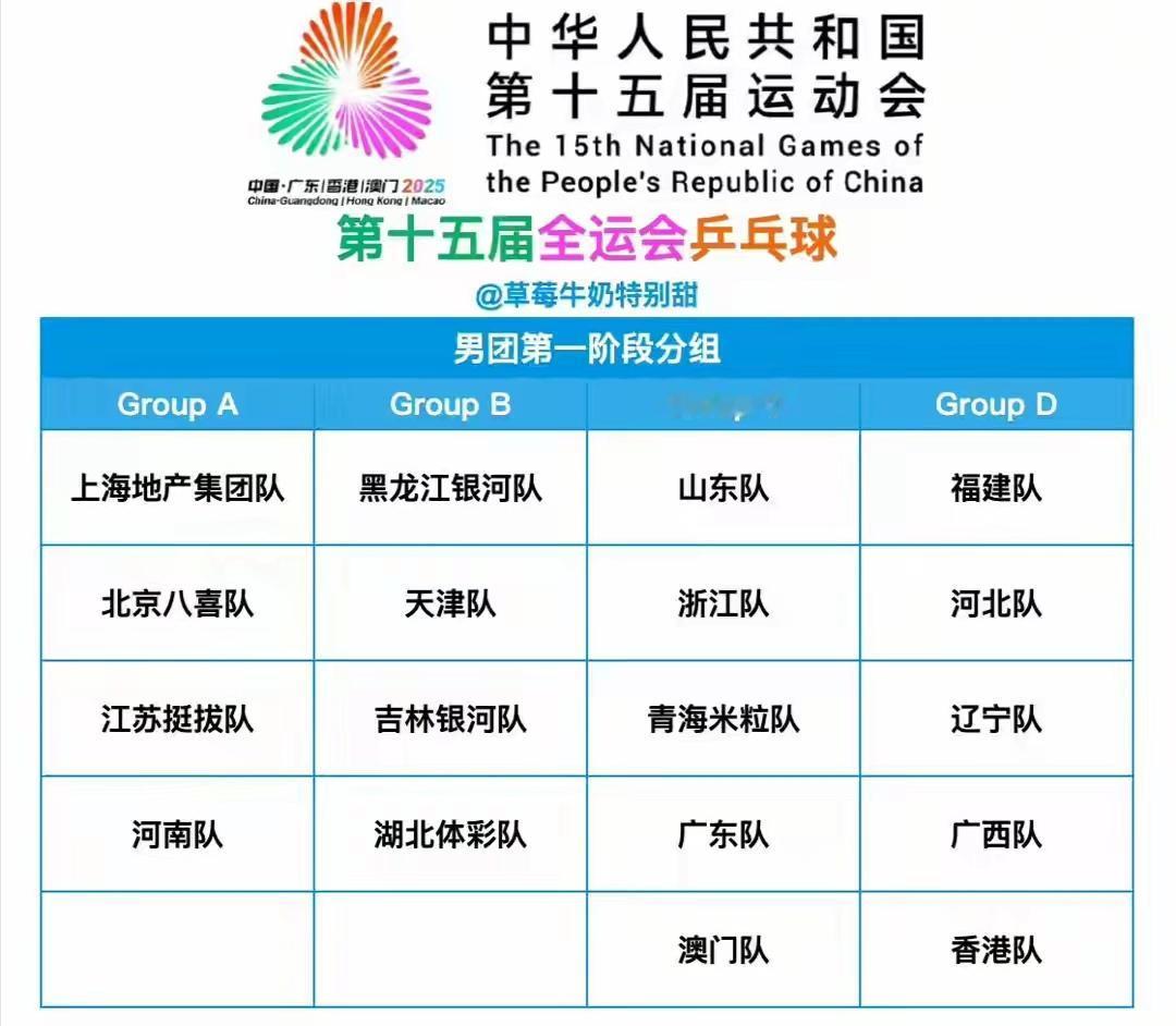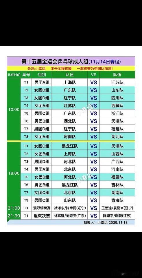 全运会乒乓球最精彩、最激烈的团体赛来了! 附11-14赛程 11月14日 10:00 全运会乒乓球成年组团体赛正式开打! 这是体现集体荣誉,团队精神,排兵布阵,斗智斗勇,顽强拼搏,最激情四射,最热情奔放的阵地战! 男女团体各分为A,B,C,D四组。 团体赛第二阶段比赛,由第一阶段各组前两名采用淘汰制加附加赛形式产生。 以小组赛的成绩确定种子,重新抽签,同组的第一名、第二名分在不同的上下半区。 团体赛尤其是新老结合,有国乒主力的省市队,将占有先机,竞争将更为強烈! 男团: 北京———王楚钦,马龙。 上海———樊振东,许昕。 广东———林高远,周启豪。 女团: 河北———孙颖莎,何卓佳。 辽宁————陈幸同,王艺迪。 江苏————蒯曼,石洵瑶。 山东————陈梦,王晓彤。 ………。 加油,乒乓健儿们!