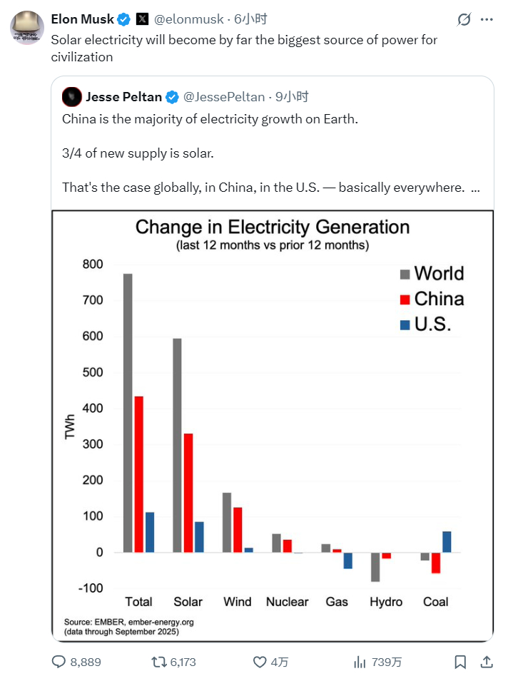 老马又在转发中吹帖:中国新增电力供应中有四分之三来自太阳能,美国也如此,全世界基本上都是如此。不同之处在于,中国的增长速度是其他国家的四倍。一个老马一个老黄,除了阿川以外美国最有权势的两个人,天天拿中国刺激MAGA。