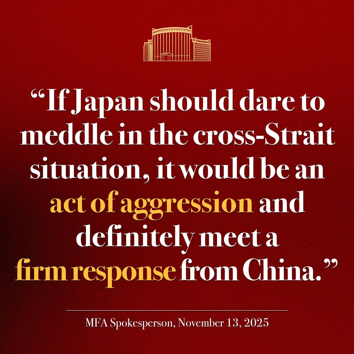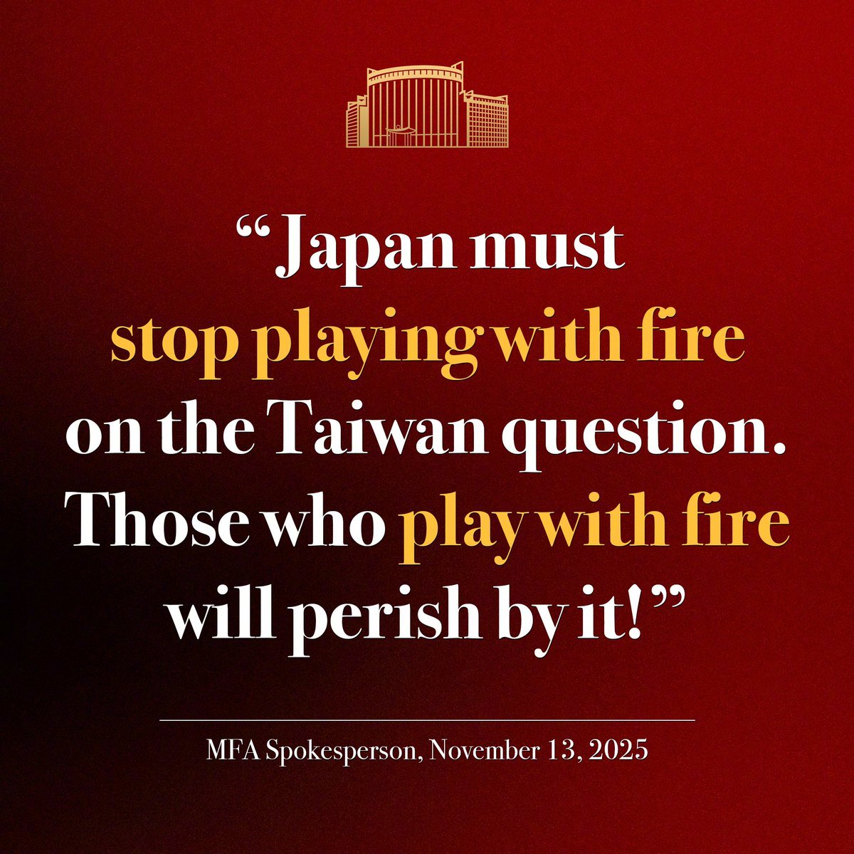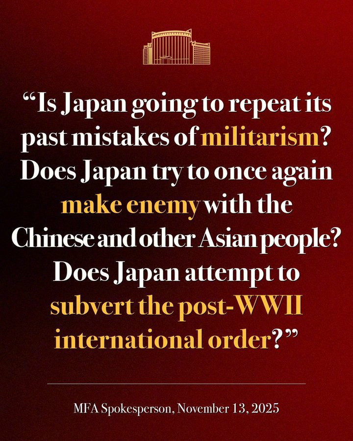中国外交部发言人海外社交账号连发三组六张海报:日本是否要重蹈军国主义覆辙?是否要再次与中国人民和亚洲人民为敌?是否企图颠覆战后国际秩序?如日方胆敢武力介入台海局势,将构成侵略行为,中方必将迎头痛击。日方不要在台湾问题上玩火,玩火者必自焚!都是先英文,后日语。