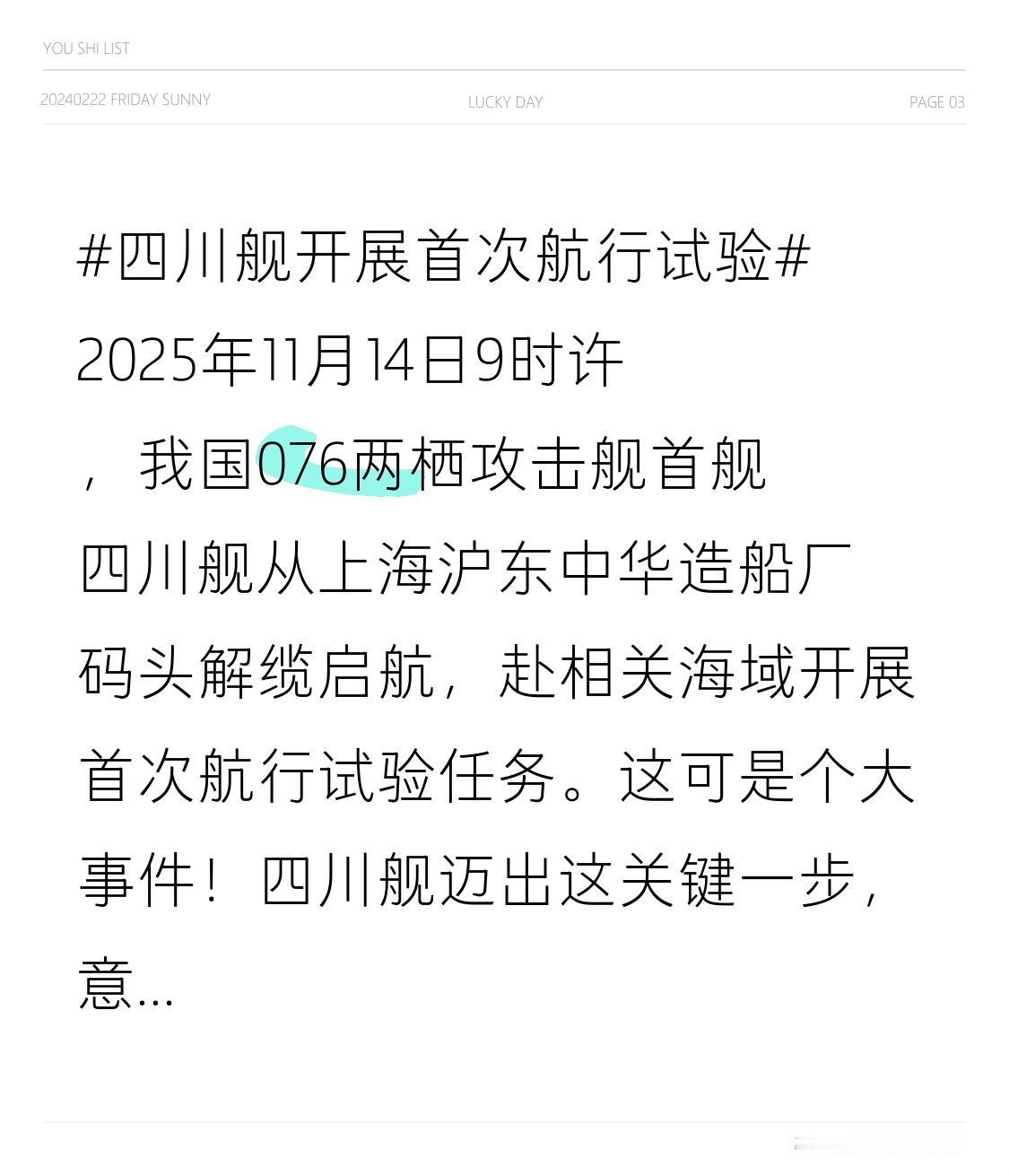 2025年11月14日9时许,我国076两栖攻击舰首舰四川舰从上海沪东中华造船厂码头解缆启航,赴相关海域开展首次航行试验任务。这可是个大事件!四川舰迈出这关键一步,意味着我国海军装备又有新的突破。一艘新舰艇的首次航行试验,就像学生第一次参加重要考试,要检测各项性能是否达标。这次试验能为后续的改进和完善提供重要数据,也让我们对四川舰未来在海军中的表现充满期待,相信它会成为我国海上力量的又一有力支撑。
