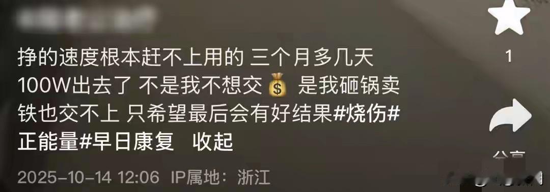 人财两空!10月24日,贵州40岁男子花费140万,病情本有所恢复 ,却突然离世!当见义勇为的勇气撞上现实的冰冷,贵州汉子钱开红用生命书写的担当,最终留给家人的却是六七十万元的债务和两个未成年的孩子。[困] 租住在绍兴一个老旧小区40岁的钱开红,从事着货车司机工作。 7 月2 日下班后钱开红和妻子正准备吃晚饭,突然楼道里飘来的一股刺鼻煤气味,察觉到楼道里的煤气泄漏,出顺着楼梯间的缝隙往家家户户钻。 出于本能的责任感,钱开红放下碗筷,起身就往楼上走 —— 他知道,楼上邻居家常年使用液化气,这味道极可能意味着泄漏险情。 走到邻居家门口,煤气味已浓烈得让人头晕,他敲了几次门都无人应答,判断屋内可能无人,便决定先关闭户外的液化气总阀门。 就在他伸手转动阀门的瞬间,泄漏的液化气遇不明火源突然爆炸,巨大的冲击波将他狠狠掀翻在地,火焰瞬间吞噬了他的衣物和皮肤,全身大面积烧伤,属于特重度烧伤,多个器官出现损伤。 接下来的四个月里,钱开红经历了多次植皮手术,全身裹满纱布,只有眼睛和嘴巴露在外面,日常全靠呼吸机维持生命,每一次翻身和换药都伴随着撕心裂肺的疼痛。 妻子每天守在 ICU 外,隔着玻璃看丈夫浑身插满管子的模样,常常在走廊角落偷偷抹泪。 她想起丈夫出门前还说,等这个月运费结了,就带两个儿子去买新球鞋,可眼下,连保命的钱都没着落。 钱开红的父亲前年因直肠癌去世,七年治疗花光了家里所有积蓄,还欠了些外债,就在出事前几个月,他们才刚还清大部分车贷,原本以为日子终于能松口气,没成想横祸突至。 治疗的费用像滚雪球一样越积越多,前后共花去 140 万元,医保报销了一部分,网友得知事迹后捐赠的几万元只是杯水车薪,亲戚朋友能借的都借遍了,还是欠下六七十万元债务。 10 月 24 日清晨,钱开红突然出现脑死亡症状,虽经全力抢救,遗憾的是钱开红抢救无效离世。 钱开红的离世,让这个本就摇摇欲坠的家庭彻底垮了。 两个儿子一个读高中、一个上初中,接到母亲的电话时都懵了,赶到医院看到父亲的遗体,平日里调皮的小儿子哭得直抽噎,17 岁的大儿子紧紧抱着母亲,眼泪无声地砸在她的肩膀上,却一句话也说不出来。 钱开红以前的同事们提起他都赞不绝口,“他就是个热心肠,车队里谁的车坏在半路,他不管多晚都会赶过去帮忙,老乡有困难找他,从来不会推辞。” 出事后,不少老乡和同事自发凑钱相助,你五百我一千地送到医院,可这点钱在巨额医药费面前,终究是杯水车薪。 为了还债钱开红的妻子尝试过直播带货,镜头里的她眼窝深陷,脸色憔悴,对着屏幕一遍遍讲述丈夫的事迹,希望能获得网友的关注和支持。 可直播间里常常只有寥寥十几个观众,偶尔有几句安慰的留言,却很少有人下单。 当地相关部门了解到钱开红的事迹后,表示会为他申请 “见义勇为” 称号,能够给予一些帮助,可申请流程较为复杂,需要层层审核,全部走完需要时间,真心希望申请可以早日批复,让给这个破碎的家加一些温暖。 网友们对此见义勇为事件也提出了各自的看法: “看到钱开红的故事,心里太不是滋味了,英雄流血流汗又流泪,真的让人心疼,希望当地政府能尽快给他一个见义勇为的认定,让他的家人得到应有的抚恤和保障。” “这件事最让人寒心的是被救的邻居,人家为你差点搭上命,最后就拿出两万块然后躲起来?于情于理都说不过去,法律上是不是也应该有规定,受益人需要承担一部分补偿责任?” “140万的医疗费,对一个普通家庭来说就是天文数字,我们的医保和大病救助体系在面对这种极端情况时,能不能有更快速、更有力的应急机制?不能让英雄自己扛下所有。” “除了同情,我们是不是也该想想,遇到燃气泄漏这种专业险情,普通人第一反应应该是疏散和报警,还是直接上去处置?提倡见义勇为的同时,是不是也要普及科学施救的知识,避免不必要的牺牲?” “希望媒体的报道能真正推动问题的解决,而不只是一次性的流量。持续关注钱开红的家人后续能不能拿到认定,债务能不能解决,两个孩子能不能顺利上学。这才是对英雄最好的告慰。” 对于钱开红的见义勇为您有什么看法?或者对于完成见义勇为保护机制有何建议?欢迎在评论区分享! 信息来源: @山河新闻