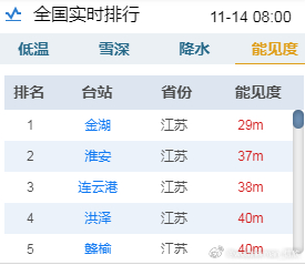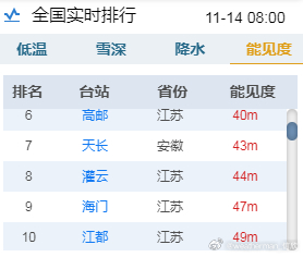 【雾和霾】今晨河南安徽江苏多地出现大雾,江苏中北部甚至出现了成片的特强浓雾,8时多个站点能见度不足50米,比如:江苏金湖29米、淮安37米、连云港38米、洪泽40米、赣榆40米、高邮40米、灌云40米、海门47米、江都49米,安徽天长40米。另外从空气质量看,河南、安徽部分站点出现重污染,雾和霾混杂。今天白天雾逐渐减弱,霾还会持续。明晨在河北山东江苏等地,可能还有大雾。16日随着冷空气南下,雾和霾自北向南逐渐消散。17-20日,中东部总体处于冷高压前部,大气扩散条件好。雾和霾能消停一段。