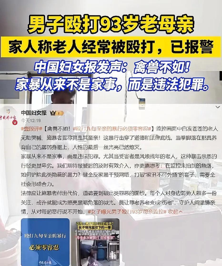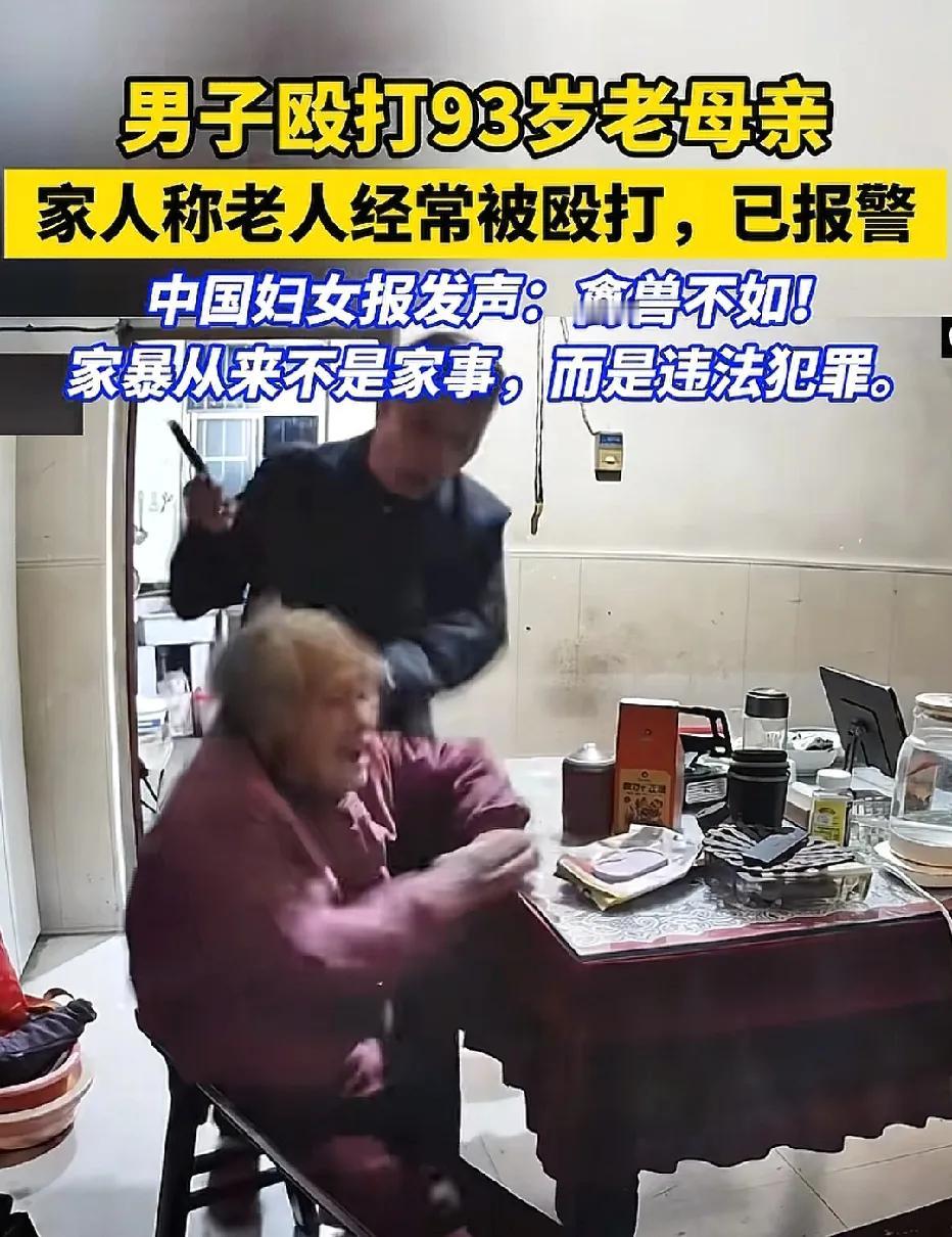 江苏常州,93岁老太太育有4女一儿,4个女儿嫁人后,老太太跟着小儿子一起生活,4个女儿为了方便看到母亲,她们在家里安装了监控,谁知,却意外发现弟弟暴打母亲的一幕,女儿气得将此事曝光,小儿子结局令人舒适。 视频显示,一男子一边拿手机,一边暴打93岁老母亲。 姐妹4个又气又心疼,她们多疼老母亲呀,谁能想到弟弟如此狠心。 这次她们决定把这段监控视频给发到网上,让大伙儿评评理。 视频一出来,好多人都感到很气愤,怎么能这么对自己的老母亲。 事情是这样的,93岁老母亲育有4女1儿,随着女儿们嫁人,重建家庭后,年纪一大把的老母亲就跟着儿子过。 都说养儿防老,老母亲的晚年生活令人担忧。都指望着我养你小,你养我老。 可小儿子却是如此对待母亲的。 比起嫁出去的4个女儿,她们依旧是贴心的小棉袄,不会不管老母亲。 她们会时不时送一些食物带给老人家,她们知道母亲年事已高,也想陪在她身边尽孝道。 可是路途遥远,又不能时时见面。 总怕老母亲在小儿子家没人好好照顾,受了委屈自己也不知道。 孝顺的几个女儿一商量,决定在家里安装监控,这样就能随时看到母亲,就如同她在自己身边一样。 平时没事就打开手机看看,心里也踏实点。 可谁能想到,这监控装了没多久,就拍出了让她们气得浑身发抖的事。 有一天,女儿们跟往常一样打开监控看母亲,结果就看到屏幕里,她们的亲弟弟,一边手里拿着个手机,一边对着93岁的老母亲又打又骂,下手还挺重。 老太太年纪大了,浑身没力气,想躲都躲不开,只能任由他打。 那场面看得四个女儿心都揪碎了,恨不得立刻冲过去把弟弟拉开,保护好母亲。 老母亲本能的躲到了厨房,以为小儿子会住手。谁知小儿子更加变本加厉的下毒手 对于此事,后来其中一个女儿发声,这不是弟弟第一次打老母亲了,本着家丑不可外扬,她们只好私底下教育弟弟,希望能善待老母亲。 谁知弟弟不听劝,这次也不知道什么原因触动了他的逆鳞,不管不顾暴打老母亲,如同打在她们身上一样疼。 既然弟弟如此不孝,教育也教不好,那就将此事曝光,让大家看看他的真面目。 与此同时,四个女儿赶紧一起赶到弟弟家,二话不说就把老母亲从他那里接了出来。 她们下定决心,以后母亲就由姐妹几个轮流照顾,再也不让她受半点委屈。 至于那个暴打母亲的小儿子,最后已被警方抓获,等待他的将是法律的制裁。 不管是四个女儿,还是知道这事的人,都觉得挺解气、挺舒适的。 不管怎么样,天下无不是的父母!就算母亲年纪大了有做得不妥的地方,也绝不是动手打的理由。 老人的“错”顶多是沟通问题,而暴力是实实在在的违法和伤害,既违背法律,更丢了为人子女的基本良心。 男子也是为人父母,自己这样对待母亲,以后自己的子女会不会这样对待他,他应该反思一下。 那么,从法律角度看,该如何看待此事呢? 《民法典》第26条规定:成年子女对父母负有赡养、扶助和保护的义务,成年子女不履行赡养义务的,缺乏劳动能力的父母有权要求其给付赡养费。 男子的暴打行为不仅未履行赡养义务,还侵害了母亲的人身权益,老太太可要求其承担赔偿责任。 对此,你怎么看?