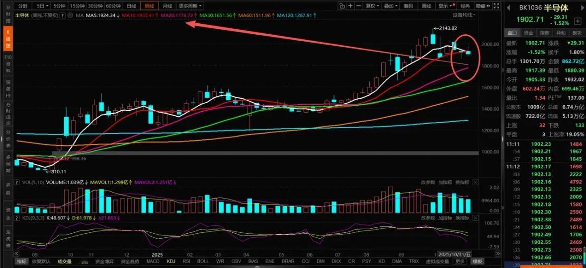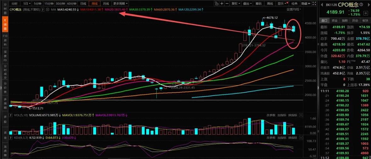 大盘指数最高涨到4034点再创十年新高,但这一切和抱团科技是无关的,靠的是银行还有石油等权重蓝筹给推上去的,这说明什么?不要总盯着指数,要知道现在的A股市场正在发生什么,给所有股民朋友说几点:1、美股科技股调整,A股科技股跟跌,现在大盘指数可以走独立行情,但是科技指数没办法走独立,都在说美股科技股有泡沫,那为何A股半导体还有算力等科技股也得调整呢?主要原因是内资机构早就认为A股科技股存在回调的风险了,所以从10月份开始机构就拉高撤退了,只是到了11月份开始,那些机构资金开始毫不掩饰的出货了。从11月初到今天,大家去看看大多数科技成长板块的走势,调整的势头一目了然了。尤其是本周,以半导体还有算力以及CPO等抱团科技,几乎没有一天是轮动领涨的,有的只是资金的持续出货砸盘。下面四张图分别是:CPO概念周线图,半导体板块周线图,存储芯片周线图以及科创50指数周线图,能够看出什么?从周线级别来看,以半导体,CPO以及科创50指数为代表的科技成长,调整的信号非常明显了,而且这种调整周线级别来看还没有结束的信号。存储芯片因为持续在涨价,所以走的比科技其他分支要强势一些,但是今天存储芯片高位放量大跌,周线出现了明显的冲高回落。近期连续高位反复震荡,目前周线出现了上涨乏力的信号,要谨慎存储芯片短期继续补跌。(作为科技内最强的一个分支,其他都在调整的时候,存储几乎没有怎么调整,后面补跌的概率较大)2、大盘指数最高涨到了4034点,指数再次创了近十年新高,大盘指数走强不意外,因为市场风格切换了,资金逃离科技成长方向,切换到科技之外的防御板块,这对于大盘指数是支撑,也是我一直给大家说的四季度主要是看防御。这个观点在四季度刚开始的时候很多人是不赞同的,但是现在来看,还有什么争议吗?市场走势和时间是对一个人的观点最好的证明,我觉得我已经做到了在科技风险最大的时候给大家精准的提示了,也精准的点明了资金从大科技开始切换的方向。回头去看这段时间的走势,新能源赛道,周期有色,消费和医药,银行保险红利等等,这些都有过轮动上涨,唯独抱团AI科技的资金最为难受。如果你认为抱团科技是洗盘,那我觉得这是忽略事实,因为大资金早已经转为防御了,要么离场休息,要么高低切换防御避险。所以,今天的指数再创新高,依旧是和大科技无缘,主要是靠银行还有石油,医药等一些权重蓝筹或者低位板块带动为主。大家都不看好的地产板块,现在竟然也走出了趋势,这叫什么?股民散户越是跟风抱团的方向,机构资金越是不拉,反倒是大家都不看好的冷门板块,现在四季度却成为了机构挖掘补涨的方向了。事实胜于雄辩,难道说那些强行在高位科技股里的人,比那些大机构资金还有格局判断?股市是有周期变化的,也是有风格转换的,市场永远都是对的,资金在四季度选择防御求稳是有理由的,不是说靠意念说科技是政策方向,就得持续的涨。涨多了回调,未来或许还有机会上涨,但是你能扛得住现在机构资金的出货吗?来年在涨的话,还会涨到你手里的科技股吗?这些都是股民散户需要思考的问题;3、最后,我觉得大家现在不要只盯着大盘指数了,要知道市场在发生了什么?市场现在走的风格节奏就是上面我说的那些,慢慢大家会发现,科技抱团走弱之后,其他的低估值洼地正在走出估值修复,不要说这些板块只是短暂轮动了,这也是慢牛行情的一个特点。尤其是在当前结构牛市行情里,长期拿一个板块不一定就是好事,大涨炒作之后该调仓换股就调仓换股,不同的阶段就做不同的事情。三季度科技大行情把指数带到了4000点,现在到了4000上方了,资金还继续拉升科技吗?资金选择了金融权重蓝筹。所以,4000点下方是科技成长进攻行情,4000点上方的行情应该是金融,消费等价值蓝筹修复的行情为主了。而就在今天中午收盘后,一则消息刚好验证了我上面的观点:约束金融行业“内卷式竞争”,这意味着金融行业反内卷也要开始了。所以,当大家把目光放在科技成长之外的一些方向,也会是一片星辰大海,尤其是那些不被看好的优质蓝筹,正迎来属于他们的修复时代。4、如果大家仔细读了我最近的观点,应该知道近期我说的方向和思路了,所以读懂的人不需要多余的解释,自我欺骗的人永远也是喊不醒的。每个人对于市场的理解和操作认知都是不一样的,不强求什么,市场会给出最好的解释。所谓的格局,都不如把当下做好更为关键,哪些是出货,哪些是建仓布局,会越来越清晰。