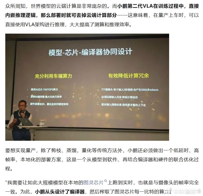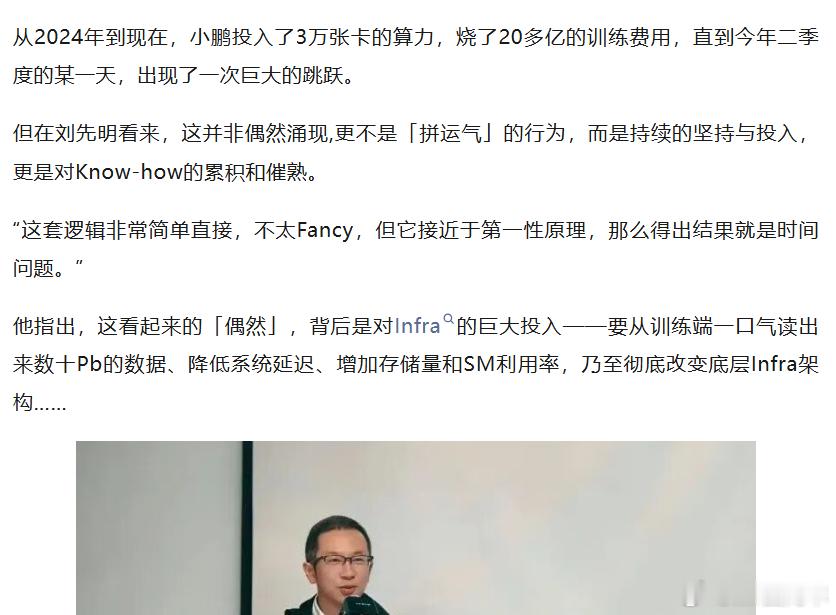 再细品刘先明在 的技术分享。文字中都能感受到这种从阴霾中看中曙光,结果发现是一条坦途大道的喜悦,做技术的人大部分应该都经历过这样的时刻。从2024年开始投入超20亿训练费,无数次内部讨论是否停掉这条路线到突然涌现出的能力,解决了场景问题,机器人走的开始像个真人……背后看似好像只是“坚持”+“投入”四个字,但实际上还包括了:1、正确的架构设计架构决定了方向,在错误的方向上跑再快,也到不了目的地2、效率导向的技术攻关通过减少信息转换和损失,减少输入到输出之间的步骤,加速训练效率3、以量产为目标的全链路优化内嵌推理,结合图灵自研芯片自研编译器,榨干每一点算力,做到模型与摄像头帧率同步(!即便是按30fps算,那也意味着模型的计算周期压缩到了33ms左右?!)