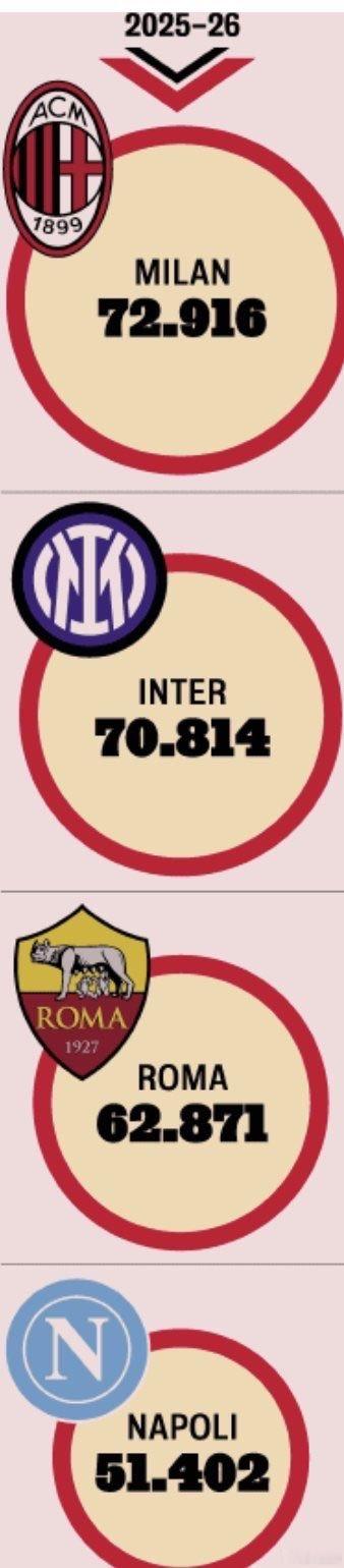 米兰体育报还列出了意甲俱乐部场均到场的观众人数 国米略低于AC米兰
