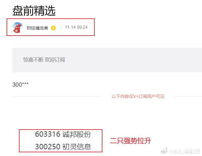 惊喜不断早盘v+关注的$初灵信息sz300250$$诚邦股份sh6