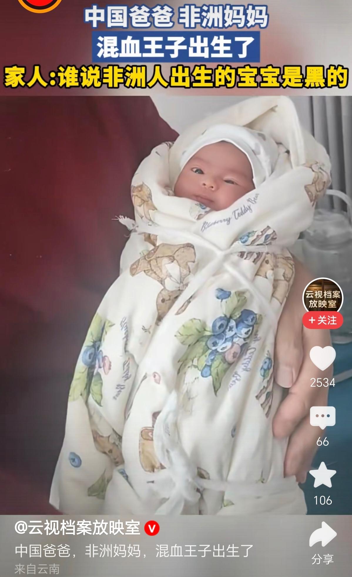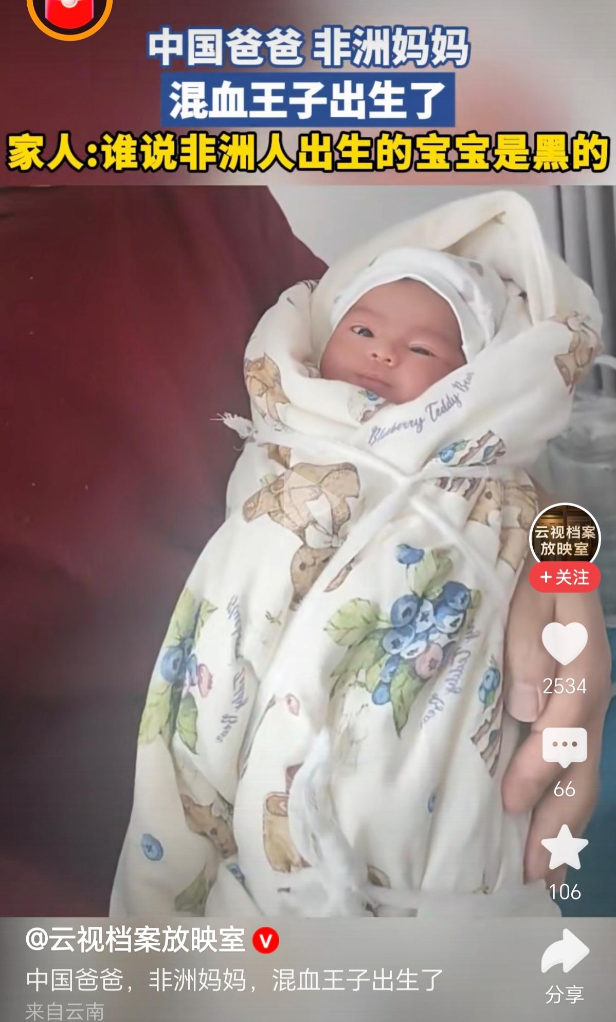 中国爸爸和非洲妈妈,他们有了爱情的结晶。生下来的混血宝宝,也非常的可爱。这次男方的基因非常强大,占据了主导地位。宝宝虽然是中非混血的,但是长的非常具有“亚洲感”,没有太多“非洲”的特征。对于跨国婚姻,我也不知道怎么评价,毕竟这是人家的爱情。但,混血宝宝确实挺可爱的。