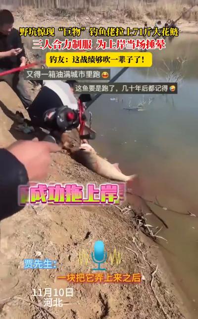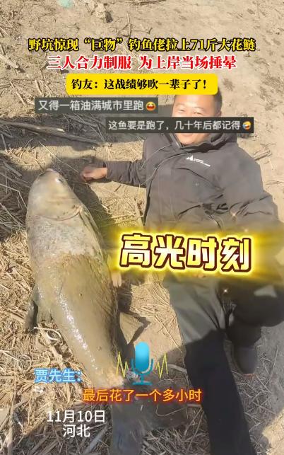 这能吹一辈子!河北邢台,一男子在野坑钓鱼,起竿时以为挂底了,没想到水下传来巨大的拉力。几个钓友一起帮忙,连拉带拽,鱼就是不肯露面。最后实在没办法,找来棍子把鱼敲晕,前后折腾了一个多小时,才把这条大鱼弄上岸,称了一下竟然达到了七十一斤。 “真没想到啊,这一杆下去,居然钓上来个‘水中怪兽’!”一条七十一斤的大鱼,引得附近许多人都赶来看热闹,有人说这是“钓鱼界的奇迹”,也有人调侃这位男子“这一杆吹一辈子都够了”。 那天男子带着钓具,和几个钓友一起来到野外钓鱼,大家支好鱼竿,摆上小马扎,一边聊着天一边等着,悠闲得很。 正在大家等待鱼上钩的时候,男子的鱼竿突然猛地一弯,竿尖几乎要触到水面。他下意识以为是挂底了,因为拉不动,也丝毫没有鱼的晃动感。可正当他准备放松鱼线重新调整时,鱼线那头却突然一拽,整根竿子差点被扯进水里! 旁边的钓友立刻意识到不对劲,有人喊:“大鱼!绝对是大鱼!”男子两手死死拽着竿子,身子都被拉得往前倾,那一刻,他的手都在抖,但兴奋得眼睛直放光。 接下来的场面堪称激烈:鱼在水下拼命挣扎,时而潜入深处,时而带着巨大水花往外冲。钓友们也没闲着,有的帮忙稳竿,有的拿抄网准备接应。可不管怎么拉,鱼就是不露头。 折腾了几十分钟,众人已经筋疲力尽,而鱼也已经被拽到了离岸边很近的地方,男子索性拿来一根长木棍,朝着那条鱼狠狠地敲了下去。只听“咚咚”几声,这条鱼总算不再挣扎了,几个人齐心协力,拉着鱼线、用网兜,一点点将这条“巨物”拖上岸。 鱼被拽上来的瞬间,所有人都惊呆了:那体型比人的大腿还粗,称了一下,七十一斤整!钓友们全场欢呼,拿出手机拍照录像,连旁边的村民都赶过来看稀奇。有人笑着说:“这鱼怕是这附近水域的‘老大’吧,能让你钓上来,算它命不好!” 这事很快就在网上传开了,有人说他是运气爆棚,也有人调侃这是“野钓界的神话”。但也有人提出了不同看法:这么大的鱼完全可以拍照留念后放生,不一定非得吃掉,毕竟那条鱼能活这么多年,已经是自然的奇迹。 当然,这并不是说男子做错了什么,毕竟对许多钓鱼爱好者而言,能亲手钓上这样一条鱼,是一辈子都难以复制的荣耀。那一刻的心跳、那种与水下力量对抗的感觉,可能比奖杯还珍贵。 总得来说,一条七十一斤的大鱼,给人们带来的不只是一场震撼,更是在提醒大家:无论生活多平凡,总有一些瞬间,会让人觉得值了。 信息来源: 闪电新闻丨钓友野坑钓起71斤大花鲢!多人耗时1小时用木棍敲晕才捕获 文丨小王 编辑丨史叔