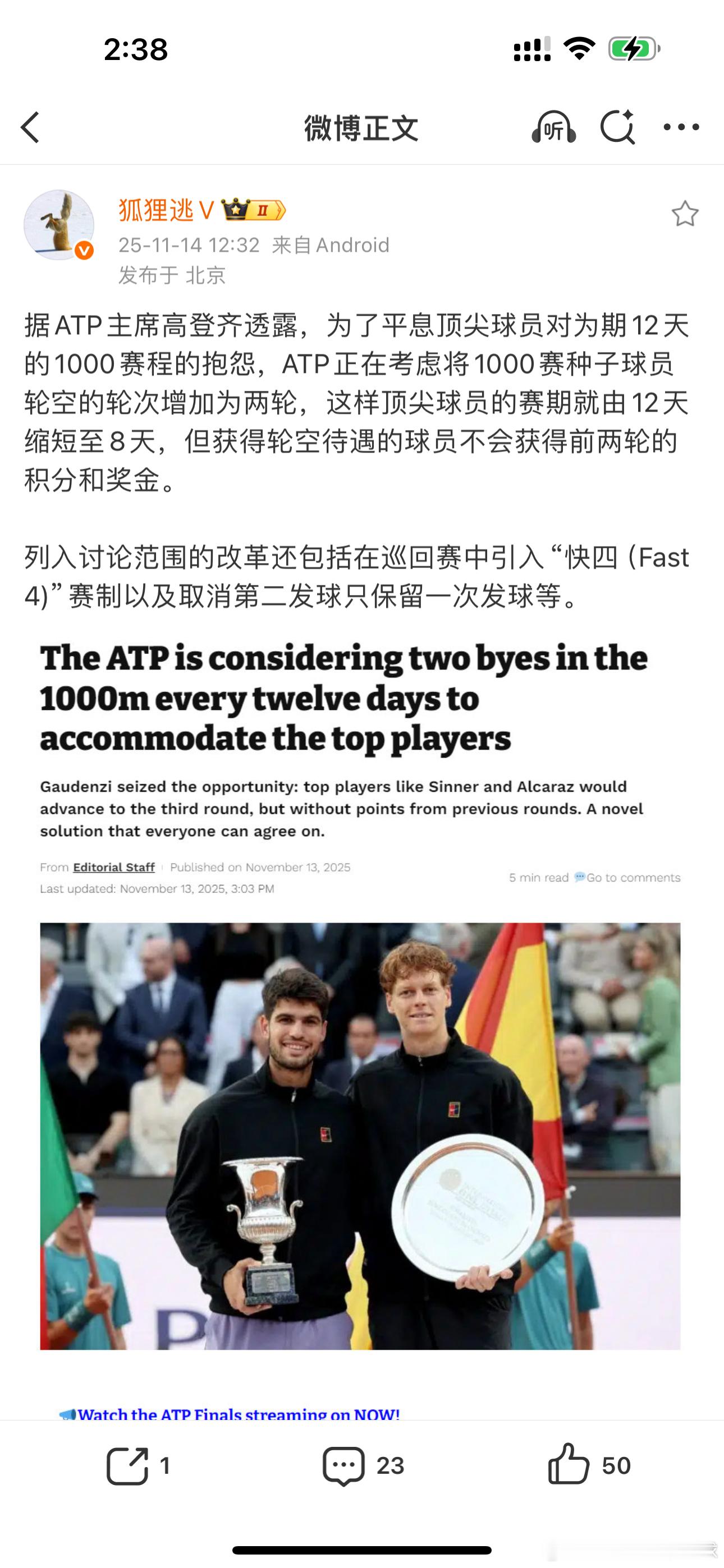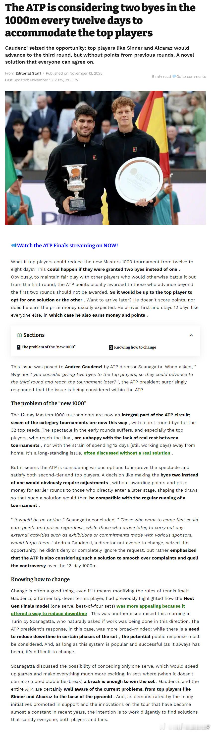 ATP主席高登奇各种操作惊煞我刷到 胡立涛老师的博文,高登奇又要“改良”大师赛了,他的奇思妙想让我大开眼界;讨论议题包括:大师赛种子两轮轮空,还引进“快四”(新生力量总决赛那种规则),还取消第二发球…..之前也看到他一些“改革”,包括2028新增一项大师赛,包括准备砍掉一些250和500赛,包括准备戴维斯杯两年一次,倒也还符合减负呼声;但大师赛这些修改议题通过✅的话,观感会受到影响,但偶然性会大增?就像乒乓球21分换成11分?