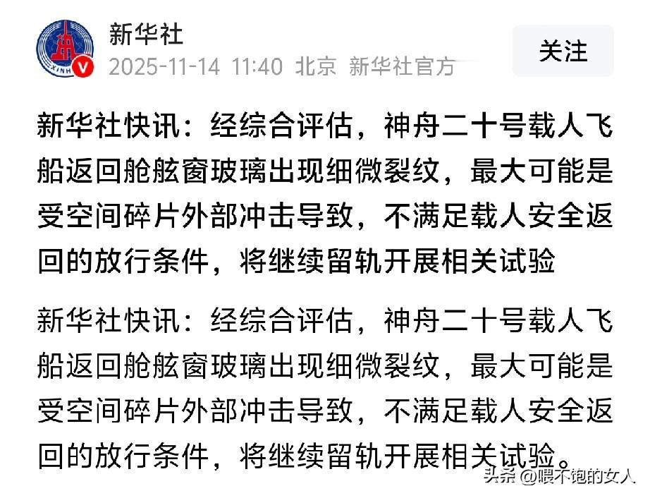 返航暂缓? 没事,安全第一!大不了神舟20号再跟神舟21号对接一下,人员到21号里面去嘛![捂脸]还有一个办法,再上去一个飞船,去接他们回来,你们说这方法可不可行?