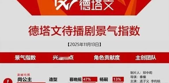 孟子义《尚公主》以一款亮眼造型拿下德塔文待播剧榜第一,造型的传播热度带动作品整体关注度提升,成为待播剧焦点。鲜明的角色形象,能提前激发观众兴趣。