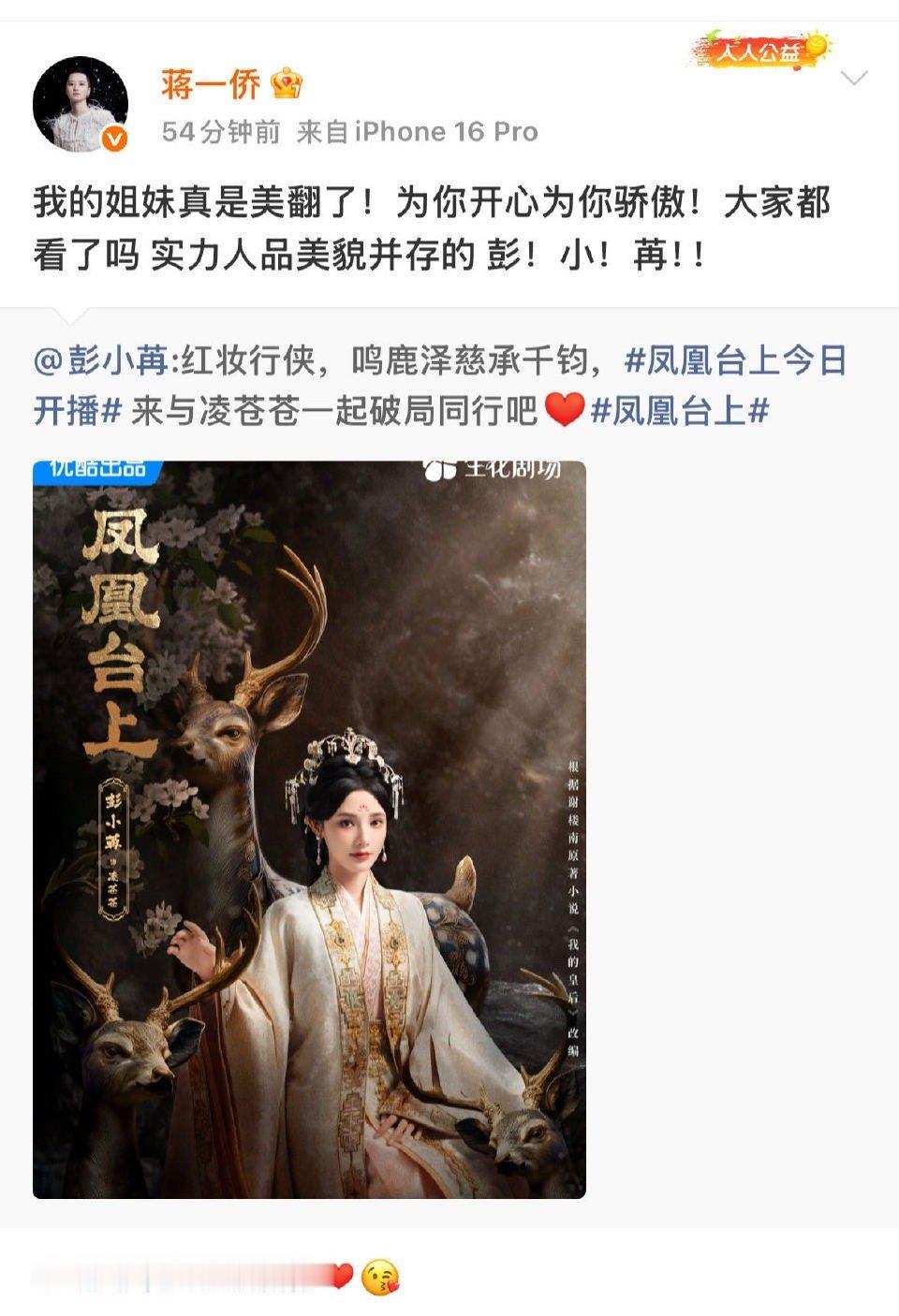 从浪姐6舞台到《凤凰台上》江湖,彭小苒这朋友圈太让人羡慕了!姐姐们团建式打call太暖了,期待凌苍苍的江湖传奇,也期待姐姐们的友情继续在江湖里发光!