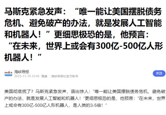 美国慌了?马斯克紧急发声,语出惊人:“唯一能让美国摆脱债务危机、避免破产的办法,就是发展人工智能和机器人!”更细思极恐的是,他预言:“在未来,世界上或会有300亿-500亿人形机器人,是人类的3-5倍!” 美国现在的债款已经突破35万亿美元,而去年全年的GDP才刚到28万亿美元左右。这意味着美国就算把一年赚的所有钱都拿出来,都不够还清欠的债。 更头疼的是利息支出,去年美国光是付债务利息就花了近1万亿美元,这个数字比很多国家的全年GDP还高。 这些钱本可以用来翻新老化的高速公路,或者给公立学校添点新设备,再不然投入到科技研发里抢占先机,可现在全填了债务的窟窿。 就在美国政客为债务问题焦头烂额的时候,马斯克突然站出来发声,一番话直接惊掉了不少人的下巴。 这位科技圈的“话题王”在公开场合明确表示,唯一能让美国摆脱债务危机、避免破产的办法,就是拼尽全力发展人工智能和机器人。 接着他抛出的预言更让人细思极恐,未来世界上可能会出现300亿到500亿个人形机器人,数量是人类的3到5倍。 马斯克这话可不是随口胡说,他的判断背后有实打实的行业趋势支撑。现在美国的人形机器人技术已经有了不小的突破,不仅能完成简单的家务劳动,还能在紧急救援等场景发挥作用。 马斯克旗下的特斯拉正在全力推进Optimus人形机器人的研发,这款机器人已经能自主完成行走、拿取物品等动作,未来量产之后成本可能会大幅下降。 而人工智能的潜力更是被多方看好,高盛在研究报告中预测,人工智能可能在2027年开始对美国GDP产生明显影响,到2034年这种推动作用将达到0.4个百分点。 如果人工智能能在10年内得到广泛应用,每年能让美国的生产效率提升1.5个百分点。这种效率提升可不是小事,它能让企业花更少的钱产出更多产品,工人也能从重复枯燥的工作中解放出来,去做更有价值的事情。 对美国来说,人工智能和机器人带来的直接好处就是经济增长和税收增加。现在美国的民用制造业面临不少压力,劳动力成本高不说,部分领域效率还上不去。人形机器人能接手工厂流水线、物流仓储等大量体力劳动,人工智能则能优化医疗、软件开发等行业的工作流程。这些变化会让美国的产业更有竞争力,赚的钱变多了,偿还债务的能力自然就增强了。 马斯克预言的300亿到500亿个人形机器人,看似夸张其实有迹可循。现在全球人形机器人的数量还很少,但随着技术成熟和成本下降,普及速度可能会超出想象。 就像智能手机从少数人的奢侈品变成人人必备的工具,人形机器人未来也可能走进千家万户和各个行业。按照当前全球人口70多亿来算,3到5倍的机器人数量,意味着每个家庭、每个企业都可能拥有多个机器人帮手。 不过这种发展也不是没有挑战,高盛的经济学家提到,人工智能的全面普及可能需要十几年时间,就像过去的电动机、个人计算机那样,需要等待大部分企业和行业都采用后,才能真正显现出宏观经济效益。而且人工智能还可能带来就业结构的变化,一些传统工作岗位会被替代,需要社会提前做好应对。 但对现在的美国来说,发展人工智能和机器人已经成了不得不走的路。债务危机就像悬在头顶的达摩克利斯之剑,常规的经济手段已经很难快速见效。人工智能和机器人带来的生产力飞跃,是目前能看到的最有希望的破局之道。马斯克的发声,与其说是语出惊人,不如说是点破了美国当下的现实困境和唯一出路。 未来几年,美国大概率会在人工智能和机器人领域投入更多资源。不管是政府的政策支持,还是企业的研发投入,都会向这两个方向倾斜。毕竟对美国而言,这已经不是“要不要发展”的选择题,而是“必须做好”的生存题。 至于马斯克的预言能否成真,还要看技术发展的速度和人类对新技术的接纳程度,但有一点可以肯定,人工智能和机器人必将深刻影响美国的经济走向,甚至改变整个世界的发展格局。
