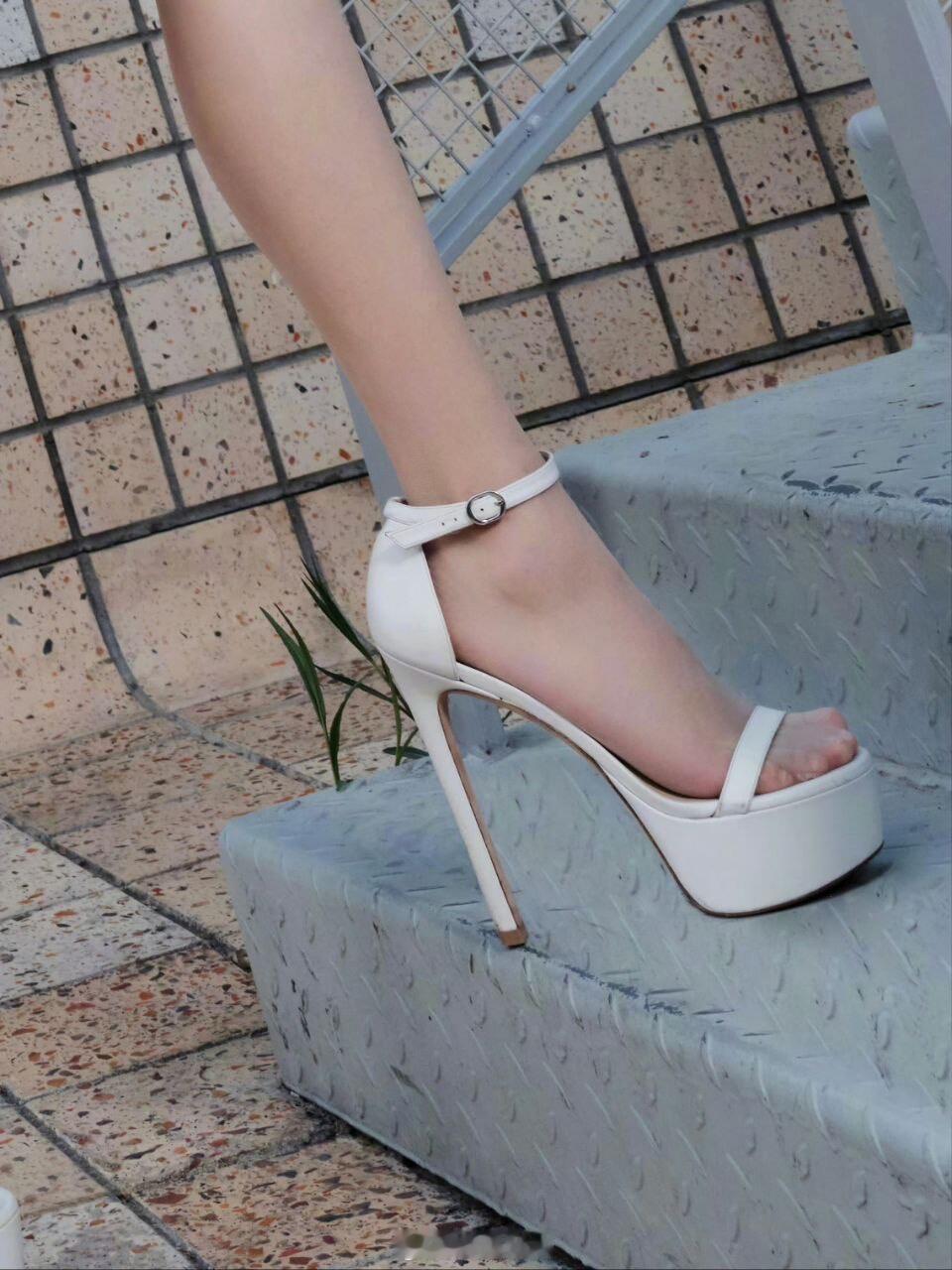 宁静肉丝一字带高跟鞋穿搭,最后有特写。