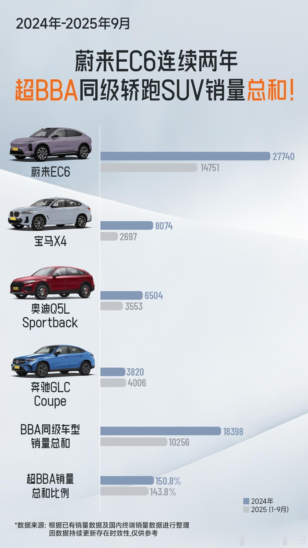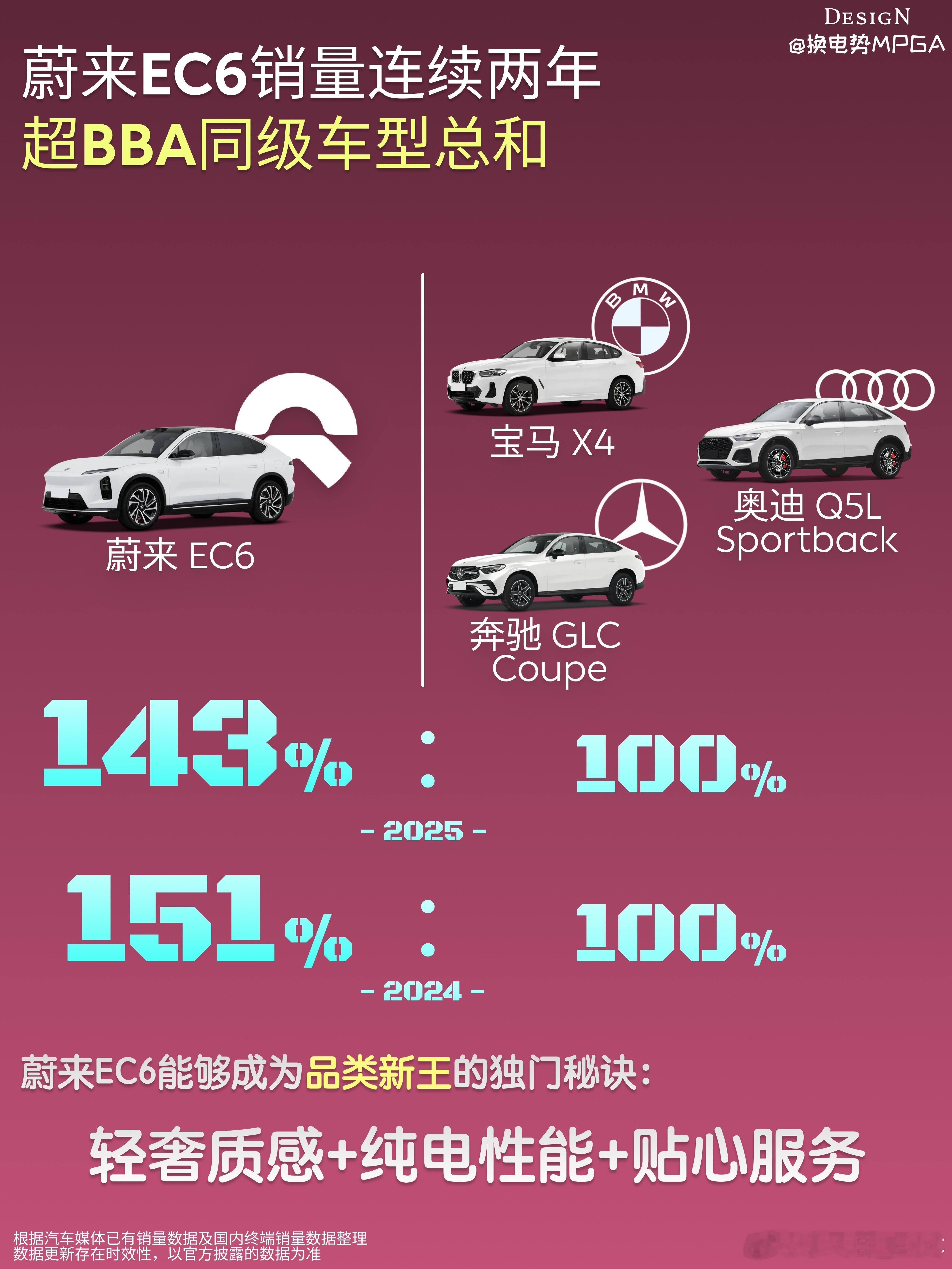 作为一个宝马四系双门版的车主,没选三系的原因就是想买一个不一样的车型开开开,对于SUV车型来说,传统造型的SUV和同样有姊妹车型的轿跑型SUV谁的销量更好不用多说,肯定是传统造型的SUV销量更好。我去看了一下一个细分市场的车型,高端轿跑 SUV 市场的销冠宝座,被一个中国品牌拿下了。蔚来 EC6在这个细分市场里已经连续五年销量力压 BBA 同级车型,更从 2024 年起连续两年单车销量超 BBA 同级总和,累计交付突破 10 万台,成为中国首个迈入 “十万俱乐部” 的纯电轿跑 SUV。一个产品力,还有一个是售价。传统BBA只要和轿跑啦,溜背啦,只要是所谓的“小众”,那售价一定是不“大众”的,一定和姊妹车型拉出好几万的差价,功能一样,就是一个造型多卖好几万有些不值当,蔚来EC6的价格策略完全不一样,它不打高溢价。另外高颜值不能只是一个样子货,EC6操控品质,智能话方面,不能体系上面,还有一个服务方面的确是超过了同品类BBA的产品。EC6 的销量证明,轿跑 SUV 不一定就是小众产品。现在选高颜值轿跑智能SUV,EC6 这台车还真不一定能绕不开呢。