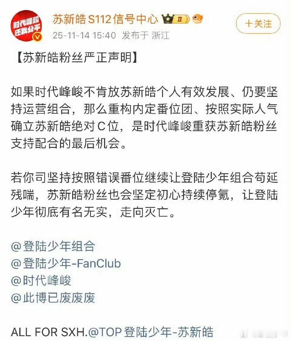 苏新皓粉丝提出绝对C位诉求并伴随停氪声明,引发不少讨论。一边是粉丝对艺人发展的重视,一边是行业资源分配的考量,理性看待才是关键