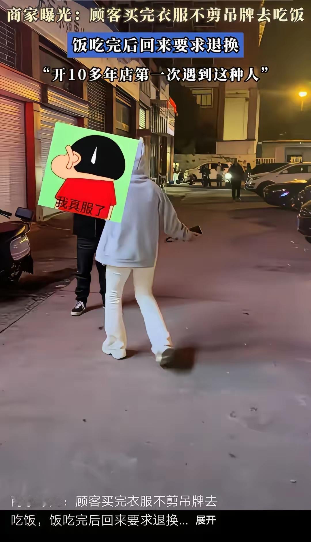 女子买衣服没有剪吊牌,出去吃火锅,两个小时之后女子回到店中要求退换,店主十分生气,表示不同意退换,更过分的是女子自己拿一件视频里的外衣,穿上就走了, 店主就追上去了,女子也知道丢人,用帽子遮住脸,于是两人在大街上吵闹。 网友评论: 我知道原来单位有一个女孩,从不真掏钱买衣服,都是在网上买,穿几天退,再买,穿几天再退,节奏掌握的很好,关键是她自己很自豪,觉得自己聪明节约,当经验告诉其他人,其实,大家都瞧不起她。 在国内不知道是怎么样规定的。在一些国家是可以的,所以国外的一些商品就很贵。 以前这种缺德的行为,会被村里人骂死,家长也会惩罚,不像现在什么都上升到法律,法院好忙哟,要点公德心好不,治安管理惩罚是不是也可以跟征信挂钩。 这是家教出问题了。一件衣服的试穿就可以反映出一个人的道德与责任,在没人监督的前提下,能够凭良心做事,这是一个人的最高品格!