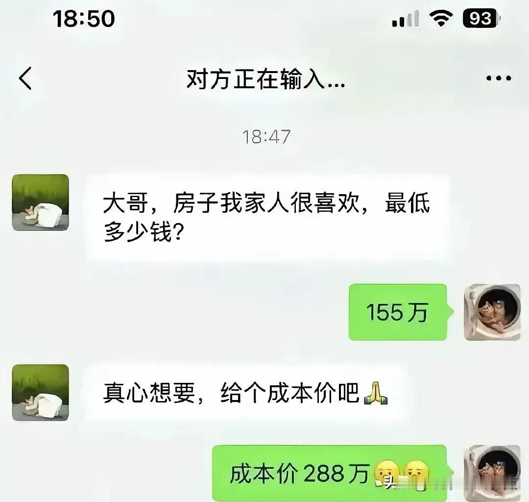 【没办法,疫情之后房价亏了】 买家:“哥,这房家人贼喜欢,最低多少?” 卖家(秒回):“155万。” 买家(卑微):“真心要,给个成本价呗!” 卖家(瞳孔地震):“成本价288万[微笑]” 谁懂啊!本来想省点钱,结果给人抬了133万,这波反向操作,主打一个“人菜瘾大还多金”💸