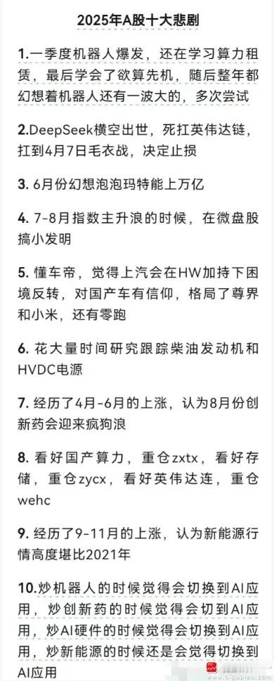 今天有人总结A股2025年十大悲剧,看很多人在转发!尤其最后一条最扎心。实话实话,今年大A是真的不错,目前沪指涨了19%,创业板涨了45.29%,科创板涨了37.65%。在A股30多年历史中,这个涨幅能排进前5。为啥大家心态还这么炸裂呢?一是部分人确实没赚到钱,二更多的人其实是对自己没有抓住机会,暴富一把的郁闷,并不是真的亏钱了。是比较支持现在的慢牛,之前4000点都是快牛水牛,急涨急跌,最终都是一地鸡毛,能赚钱带走的反而凤毛菱角。这次如果能像美股一样走出长牛慢牛,我相信赚钱的比例会高的多!