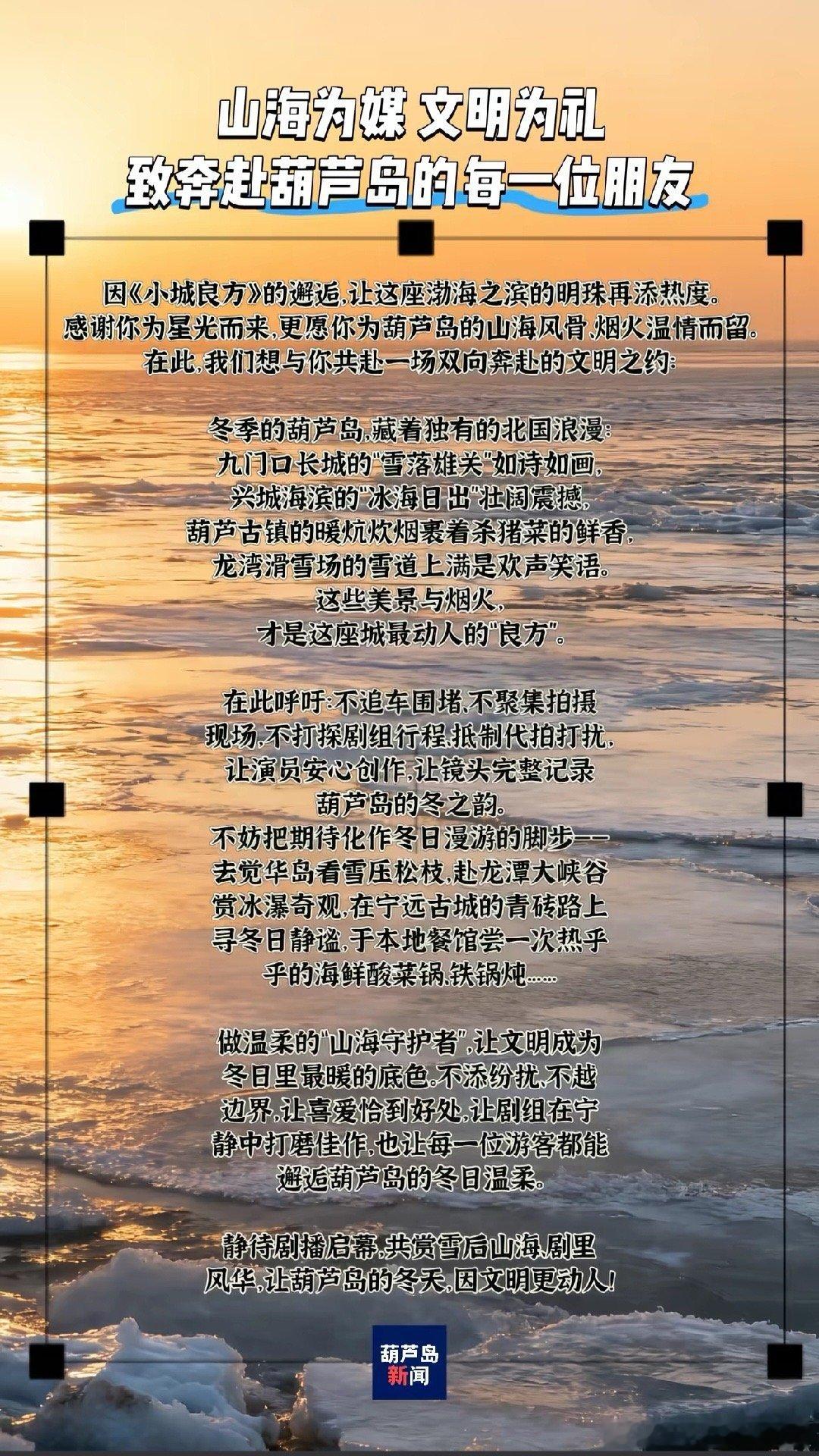 因《小城良方》的邂逅,让葫芦岛这座渤海之滨的明珠再添热度,因此官方也发了份文明倡义书,为剧组的拍摄提供良好的创作空间!