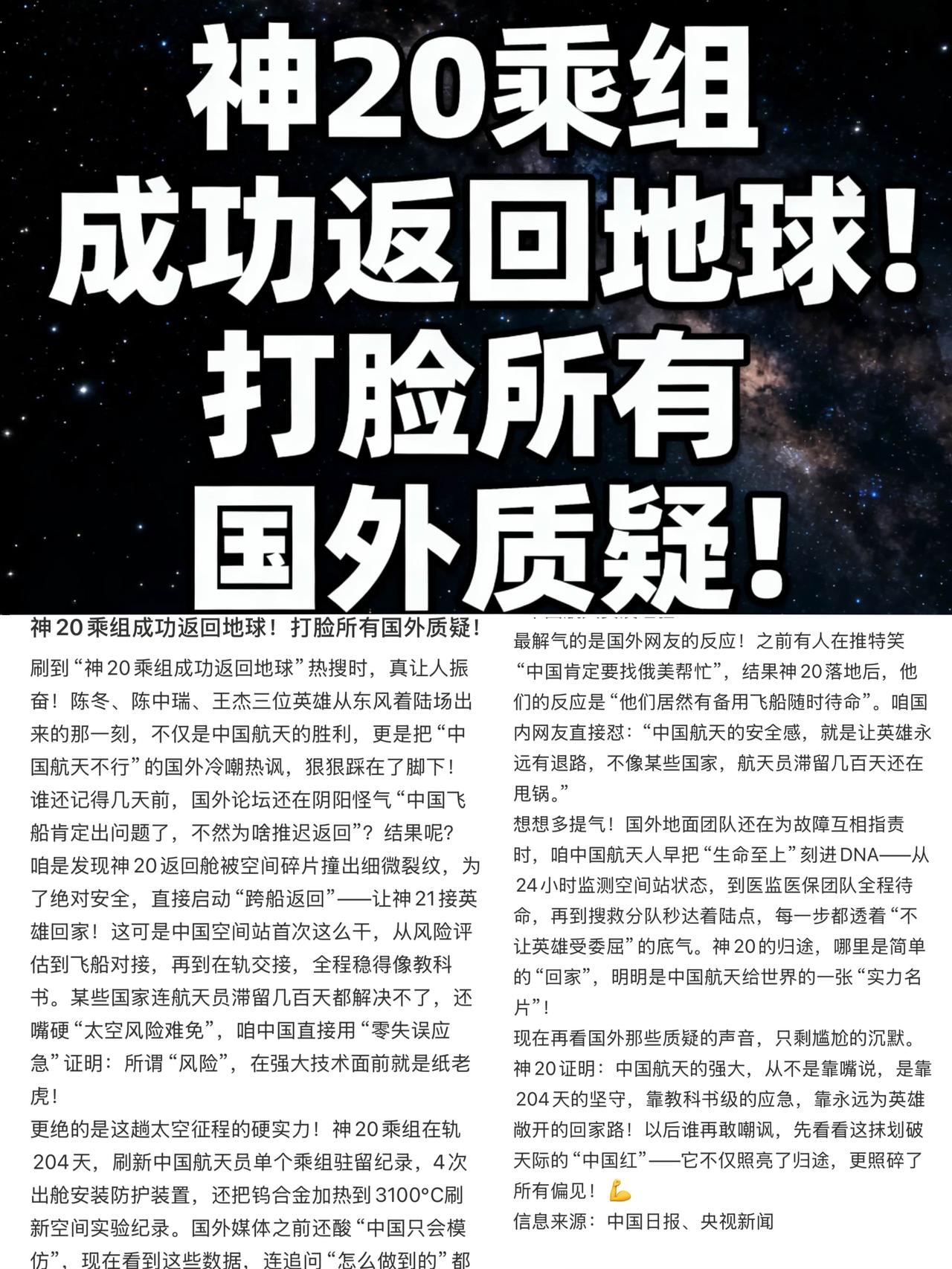 大家发现没? 神舟二十号精准落地的样子, 才是中国航天最帅的“底气秀”! 以前找返回舱像大海捞针,现在工作人员在指定地点等就行,这可不是运气,是硬实力堆出来的精准。 从穿越大气层时的“火炼”考验,到反推发动机精准控速,再到夜间也能稳定跟踪的成像技术,每一步都藏着不将就的细节。 更让人安心的是“发一备一”策略,神舟二十二号早就在酒泉待命,10天内就能应急发射,这哪里是备份,分明是给航天员的“太空双保险”。 中国航天的强大从不是单点突破,而是把“万无一失”刻进了每一个环节。 这种把风险想在前、把保障做到位的严谨,才是最让人骄傲的地方。 你觉得未来航天还会解锁哪些“安全感黑科技”?来评论区聊聊~中国神舟二十号 中国神舟二十号 神舟二十问天 神舟20号 神舟廿号
