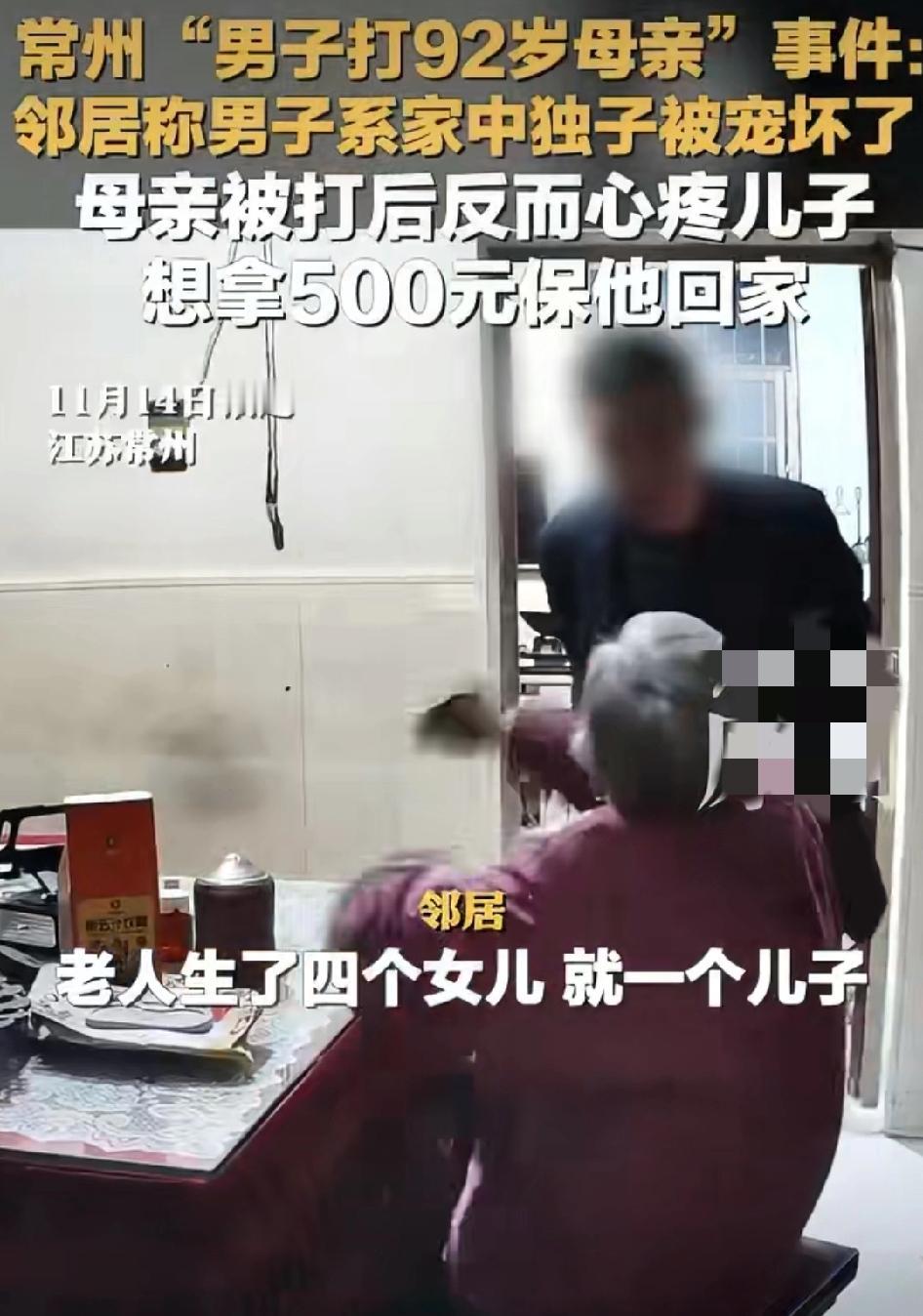 92岁母亲被儿子打后 儿子被警察带走,母亲不忍心儿子受苦,带着500元钱要去派出所把儿子赎回来 由于儿子和母亲发生口角,母亲被儿子掌掴、扯头发、按在地上打 事后儿子被警察带走 这位92岁的老人有四个女儿一个儿子,儿子是家里的老小,从小父母特别宠爱,要什么买什么,以至于儿子脾气暴躁的很 即便自己被儿子打了,也不忍心让儿子受苦,自己被打后从医院检查完身体,就急忙想着拿钱把儿子赎回来 唉!父母爱孩子可以理解,但是过分溺爱不行啊 大家说是不是