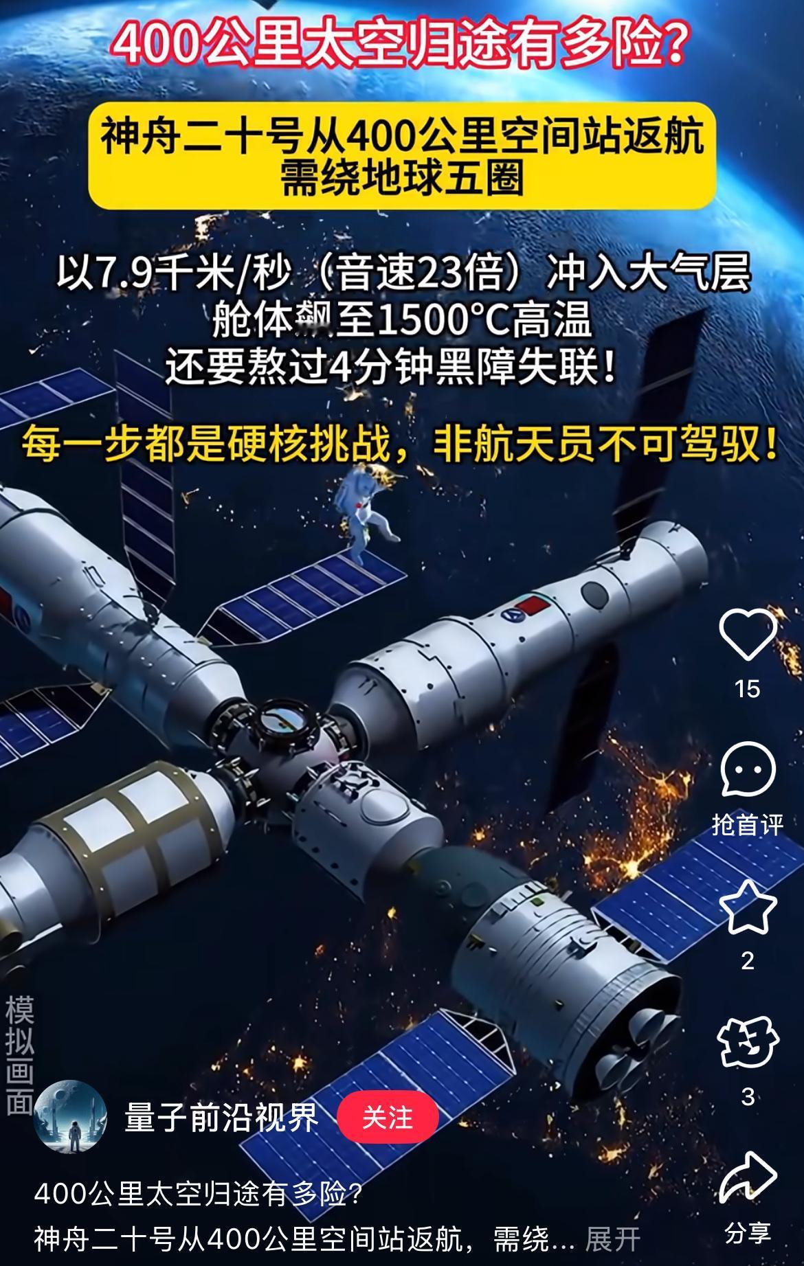 这波“中国速度”哪是救援? 分明是给全世界上了堂“安全课”! 美俄航天员遇故障要滞留数月,咱神二十遭太空碎片撞击,9天就接航天员平安回家! 别光夸速度快,核心是咱航天人刻进骨子里的“备份哲学”。 从神舟十二号就开始的“发一备一”,不是浪费,是把航天员生命放在首位的底气——天上有在轨飞船随时补位,地面还有神舟二十二号8.5天就能应急发射。 所谓奇迹从不是临时开挂,而是十几年如一日的未雨绸缪。 那些默默维护备份飞船的日夜,那些数百种故障预案的推演,才攒出这份“遇事不慌”的硬实力。 你觉得中国航天下一个“安全感黑科技”会是什么?来评论区聊聊~航天员生存法则 太空返回 神舟20