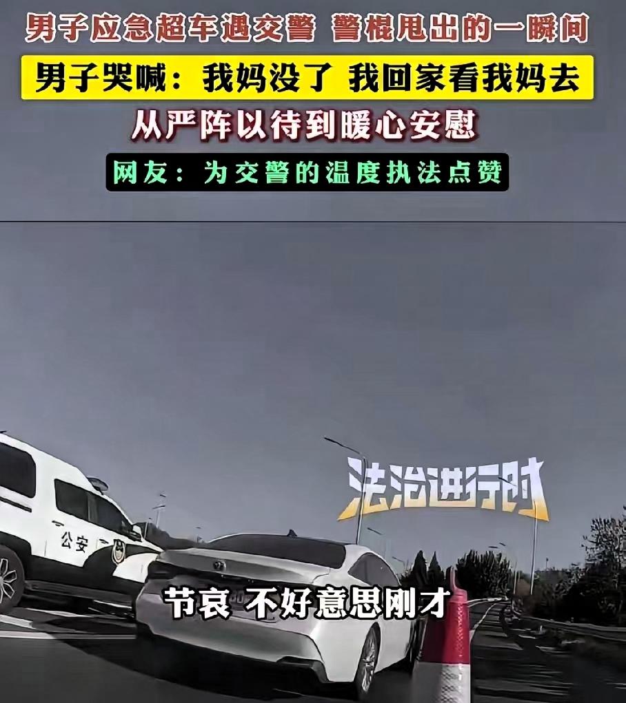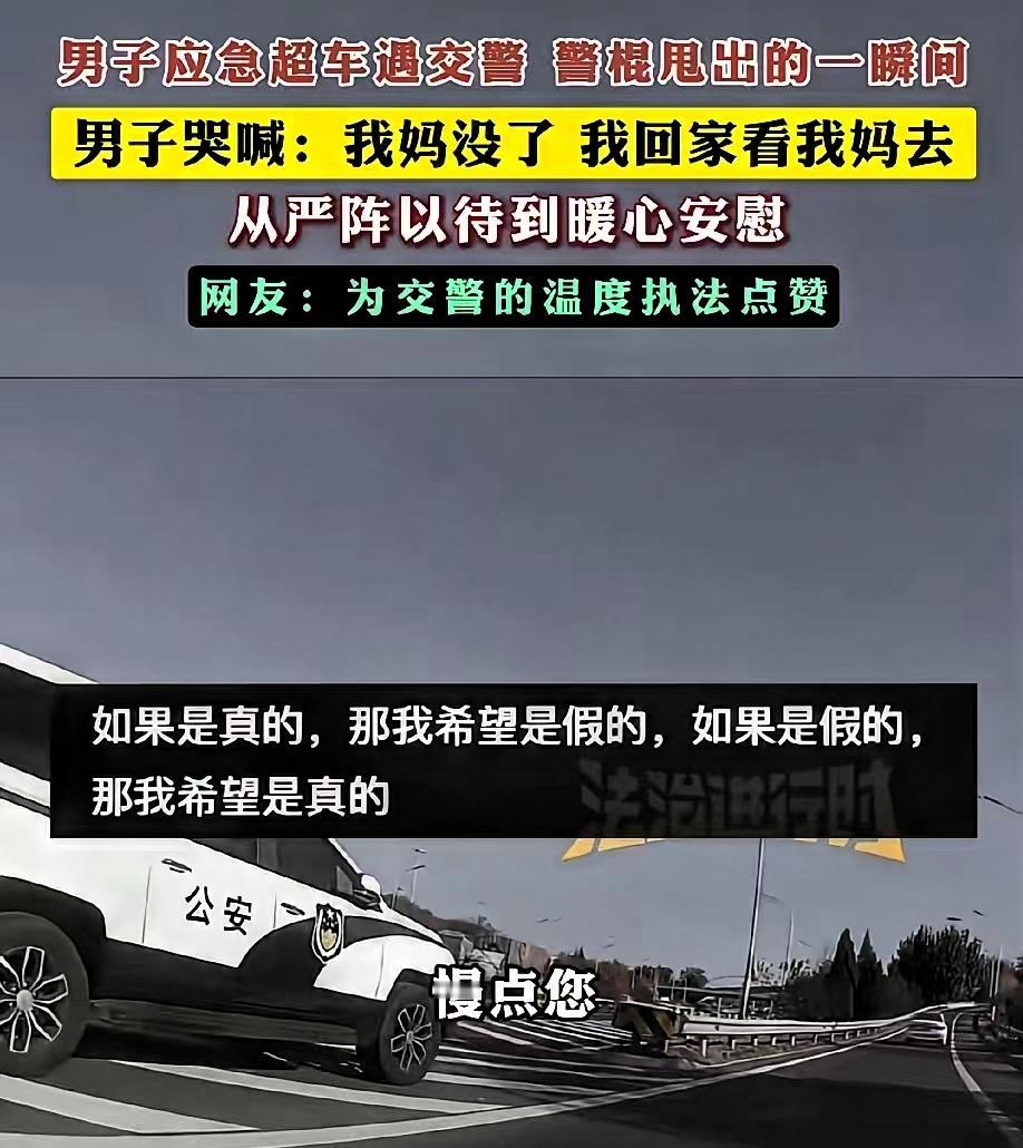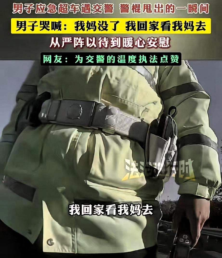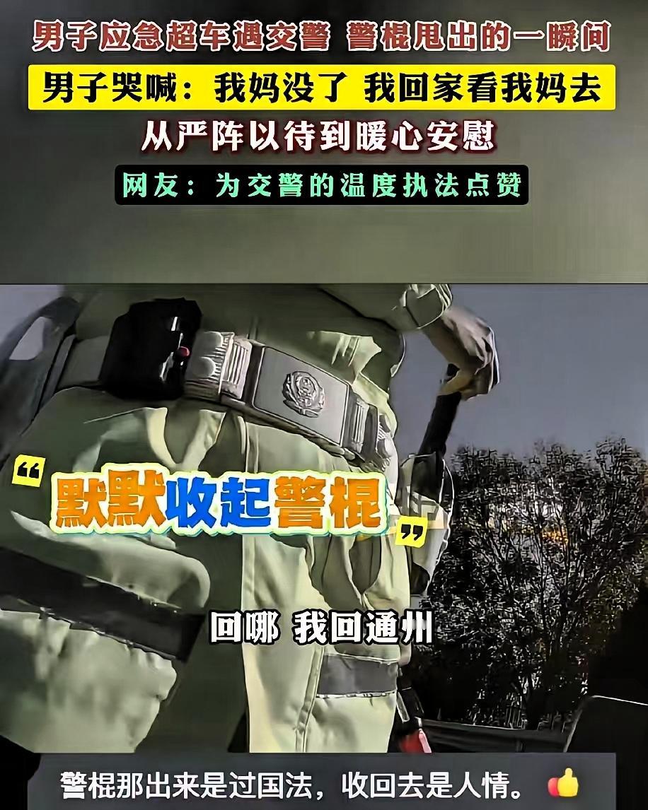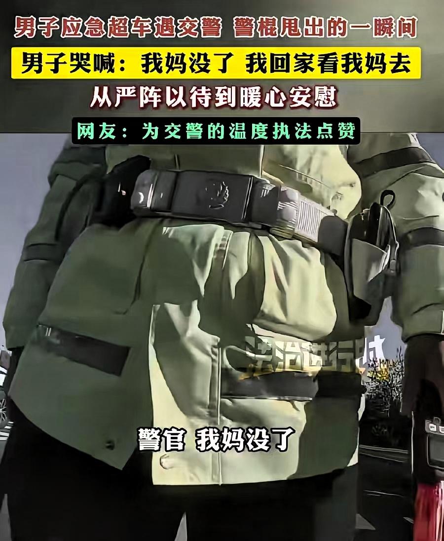 真是太暖心了!男子驾车一路狂奔,情急之下违规应急超车,被交警拦下的瞬间,气氛瞬间凝重——警棍刚要拿出,男子突然崩溃跪地哭喊:“警官,我妈没了!我得赶紧回通州!” 那撕心裂肺的哽咽,混着满脸的泪水,是失去至亲的绝望,是想立刻回到家人身边的急切,隔着屏幕都能感受到那份钻心的痛,任谁看了都忍不住心疼。 而交警接下来的操作,直接圈粉无数!没有丝毫迟疑,没有半句指责,他立刻收起警棍,问清地址,转身就用对讲机紧急通报, 全程耐心等候,没有催促,没有刁难,默默陪着一旁抹泪的男子,给了他最需要的体面与空间。 通报完毕后,交警特意拍了拍男子的肩膀,反复叮嘱:“路上慢点,千万注意安全,节哀顺变。” 还轻声补了句:“不好意思啊刚才,没弄清情况。” 一句简单的道歉,一句暖心的叮嘱,瞬间化解了所有紧张,也让大家看到了执法的温度,这才是“人民公安为人民”最真实的模样! 中国人的软肋从来都是家人,尤其是家里的白事、深夜里的急电,谁不想争分夺秒奔赴?这位交警没有死守教条,而是读懂了男子的无助与悲痛,在规则与人性之间找到了最好的平衡——他守住了执法的底线,更守住了人心的温暖。刚柔并济,懂民心、暖人心,这样的执法者,才值得老百姓发自内心的信赖与爱戴! 网友们的评论更是说出了所有人的心声:“看哭了,最怕的就是这种突如其来的遗憾”“为交警点赞,执法有力度更有人情味”“这才是真正的人民公仆,太暖了”。其实大家想要的从来不是特殊对待,而是被理解、被体谅的温柔。 生活中总有猝不及防的离别,也总有不期而遇的温暖。这位交警的举动,不仅安抚了悲痛中的男子,更给无数人带来了感动与力量。