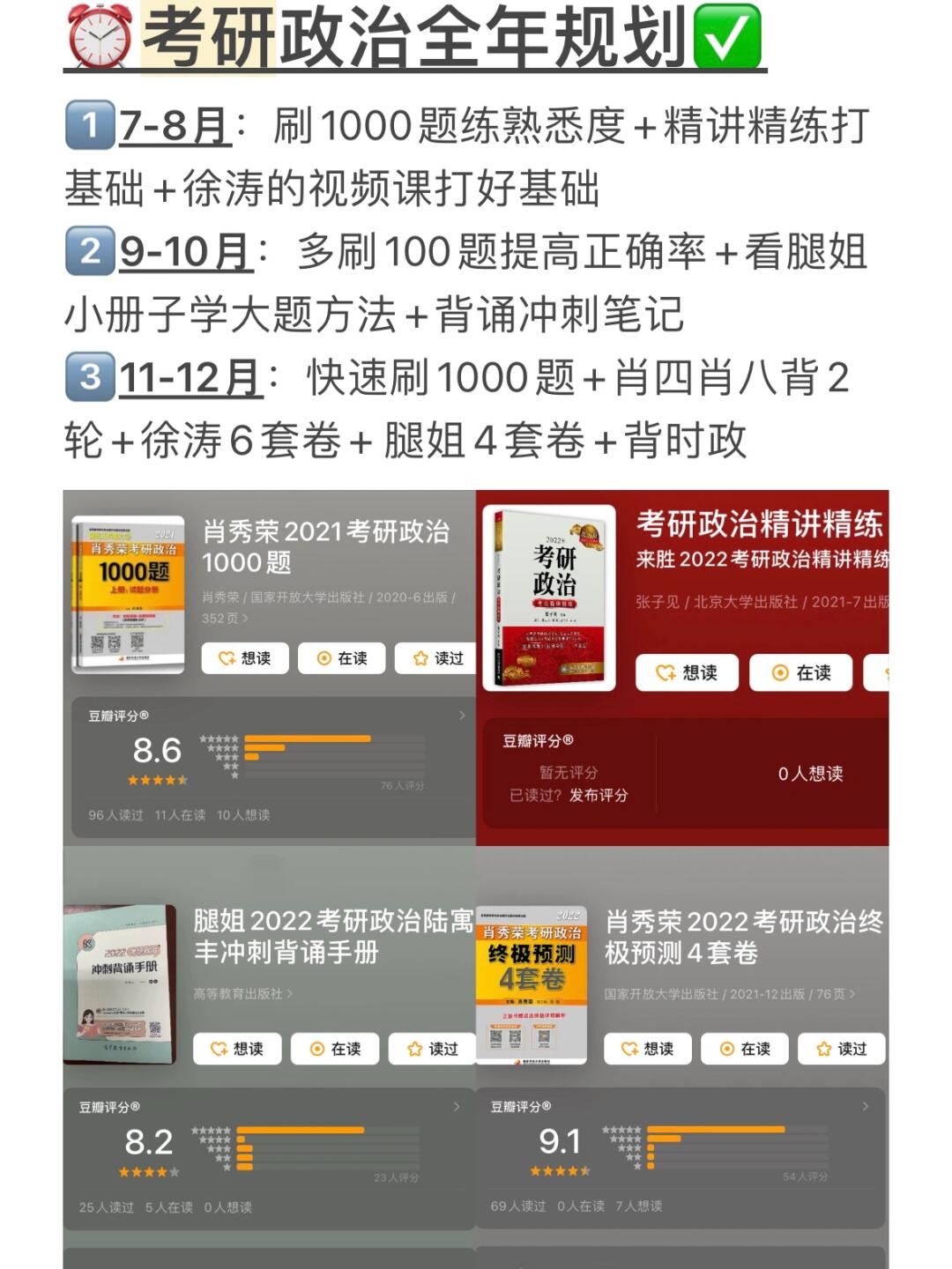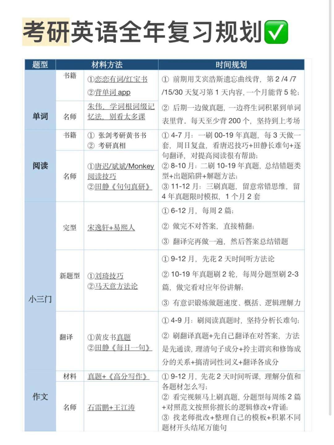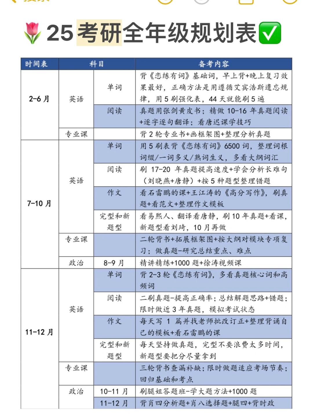我大三准备考研时,在985读研的学姐说: 考研真的会让人感受到信息茧房的恐怖,其实信息差也是有温室的,如果你习惯在同一个地方、向同一个人寻求信息,那你信息差的舒适圈就形成了,你也就掉入信息茧房中。 . 下面这篇信息,是我和学妹聊了两天的总结,希望二本的学生好好看看 ❶大三下学期开学前,你要做好3件事 ①择校:根据学科评估+研招网等确定目标学校、吃透研究生院招生简章 ②规划:全网检索:“学校+专业”收集总结经验贴,做好全年规划 ③资料:按照学科+前中后期进度,分类各科复习资料+考研跟的老师🎓 · ❷打破信息差,多渠道了解考研信息 ①研招网:近五年的考研趋势、百科、院校库、专业知识库 ②中国教育在线:多看考研频道,查报录比、搜导师和院校 ③考研历年真题库:历年英语、政治和专业课等真题 ④学位与研究生教育信息网:查学科评估,择校必备 ⑤院校研究生院:招生简章、人数、科目 ⑥二级学院官网:复试线、录取名单、初复试要求 · ❸英语规划 1.英语老师 ①阅读:唐迟+颉斌斌,水平很高很会讲课,自创阅读方法对阅读很有帮助 ②完形:跟宋逸轩,没太多废话都是干货,还教你蒙题技巧 ③语法:田静+《每日一句》,干货满满的语法老师,适合基础薄弱的听完豁然开朗 ④作文:石雷鹏很适合拖延症严重的,保姆式带写教学,王江涛适合基础薄弱 ⑤小三门:刘琦绝对绝对有优势,千货多没有太多花哨;唐静拆分组合翻译法教你拆分长难句,遇到生词也能根据结构翻译个大概。 . 2.学习规划 ①2-3月用金榜时代真题真刷,基础差的先看备考基础,背真题核心词汇+强化语法拆解长难句;②3-6月做真题学技巧,缩短答题时间;③7-10月看视频逐年讲解真题,靶向实战复习基础+总结技巧;④11-12月沉浸式模拟考试提高效率,搭配AI产品辅助提高英语 . ❹政治规划 ①8-9月:精讲精练+1000题+徐涛视频课 ②10-11月:刷腿姐答题班学大题方法+1000题 ③11-12月:背肖四分析题+肖八选择题+腿四+背时政