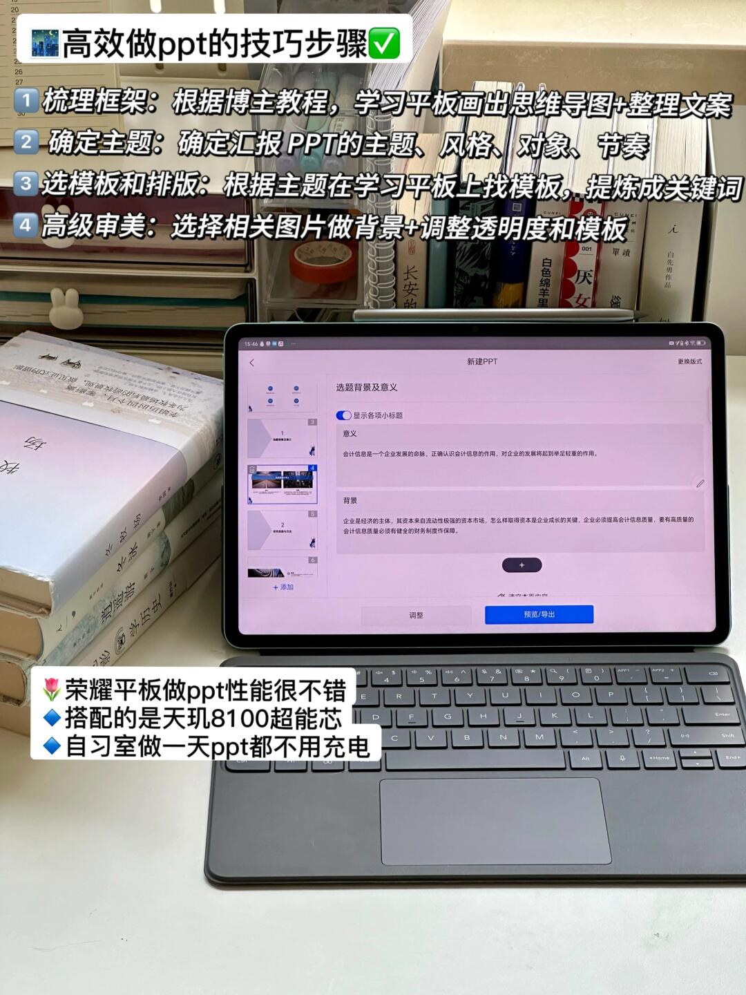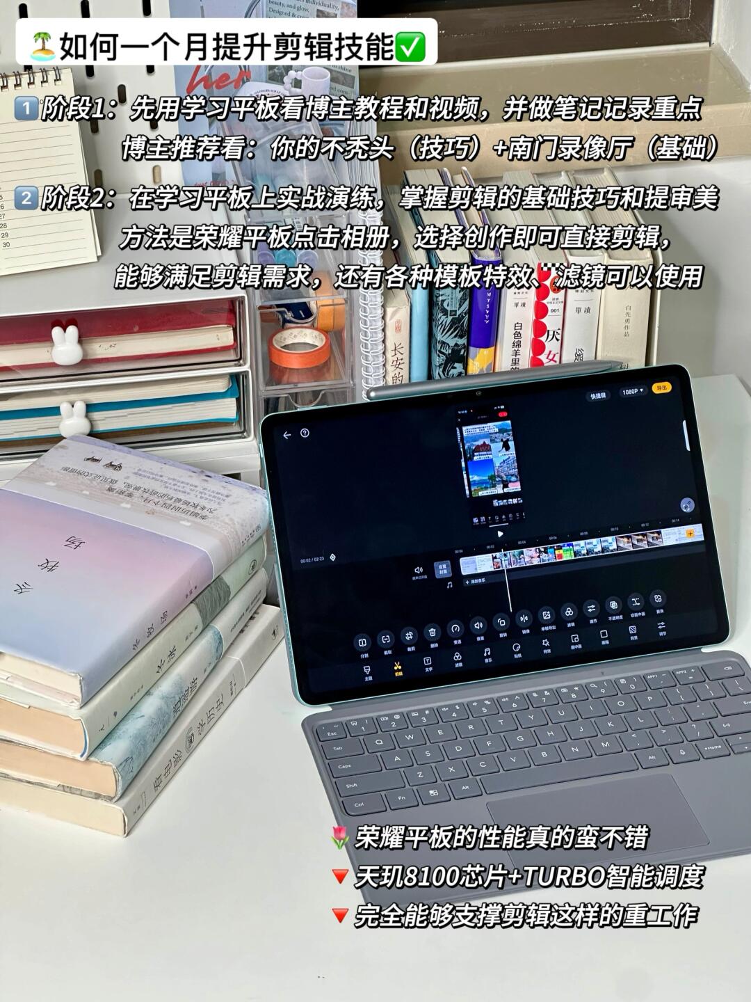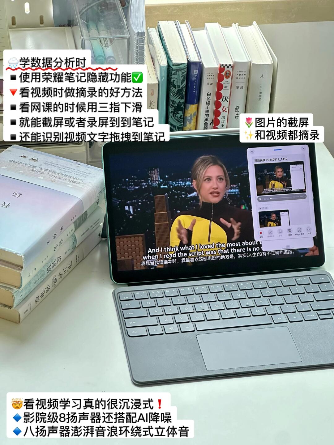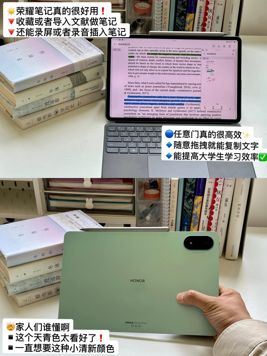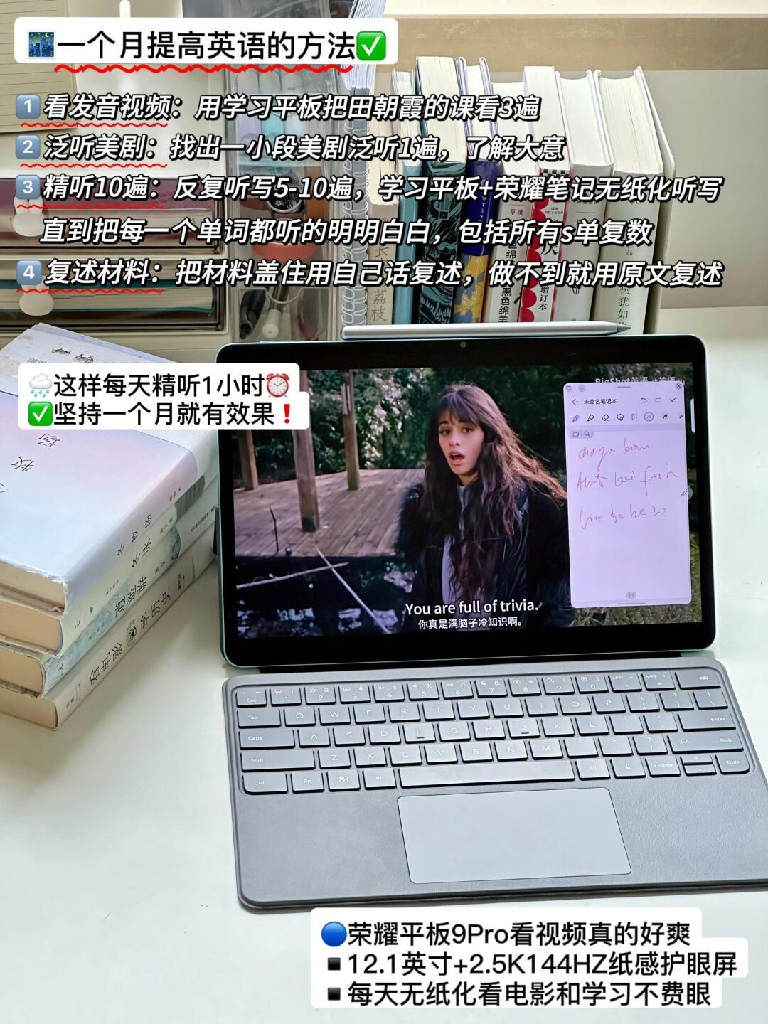 读了6年文科,我发现卷学历真的不是唯一出路,你要对照目标职业,提升自己岗位或跨岗位技能。比如学好英语就给我大学带来很多红利: . 英语竞赛拿奖保研、在北外研究生英语复试第一、分享英语经验积累6万粉丝,读研实现经济独立。学技能不一定要报课,今天我给大家分享有学习平板能自学的技能。 . ❶一个月学英语 方法是拿出一小段美剧,用学习平板先泛听一遍了解大意,然后用荣耀笔记无纸化精听5-10遍,直到能听出所有单复数,然后盖上材料用自己的话复述,1个月英语就会有很大提高。 . ❷一个月学ppt 先用学习平板听基础课,然后根据教程实践做ppt检验。旁门左道:PPT基础制作方法、技巧;方法是:先学博主视频,然后用学习平板画出思维导图和框架,并总结关键词,在学习平板上选择模板和高级配色。 . ❸一个月学数据分析 方法是:在学习博主视频的过程中,用荣耀笔记截屏或者录屏摘录文字,用于后期复盘。 . ❹一个月学剪辑 ▪️南门录像厅:教你基础剪辑方法、参考案例、剪辑思路 ▪️你的不秃头:超厉害特效大牛,教你做有创意片头片尾,拥有一部性能强劲的平板,也可以极大提高你的剪辑效率,导入导出节省不少时间。 . 我最近经常看视频自学使用的是荣耀平板9 Pro ,12.1英寸看着很爽,而且2.5K 144Hz纸感护眼柔光屏也不费眼。看视频同时可以三指下滑打开荣耀笔记,搭配手写笔记录重点和录屏,方便后面随时复盘。 . 而且它用的是影院级8扬声器,打造环绕式立体音域,学习之余看看外国电影真的很享受!我用了一段时间后,感觉这台平板续航很长,每次带着去图书馆或者咖啡店自学一天都不用找充电器,采用的是天玑8100超能旗舰芯和10050mAh大容量电池;还有实用的任意门,比如看到一段资料长按一拖就能直接收藏到荣耀笔记里,还能提高学习效率。 . 不得不说,用好学习平板对考研考证、技能学习,都有事半功倍效果,建议大家充分利用,让自己大学逆袭!
